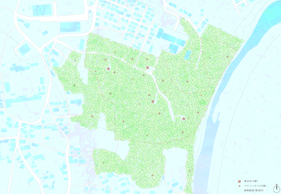 森の中にツリーハウスを作りながら、豊かな自然を守り育てていく提案である。震災で生じた廃材をツリーハウスとして再構成する事で、古い記憶を伝承しながら人と自然が共に生き続けられる初源的な在り方を考えた。