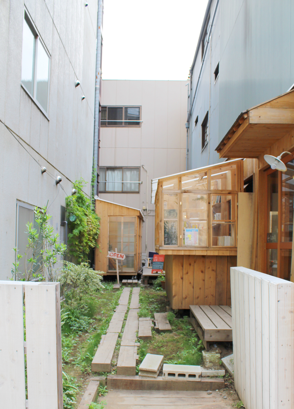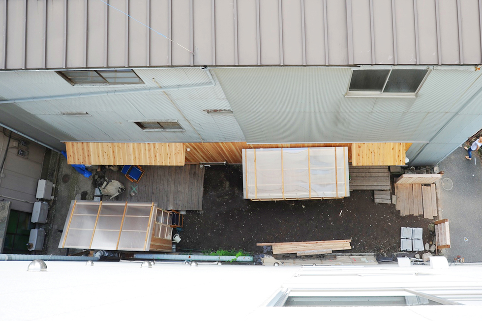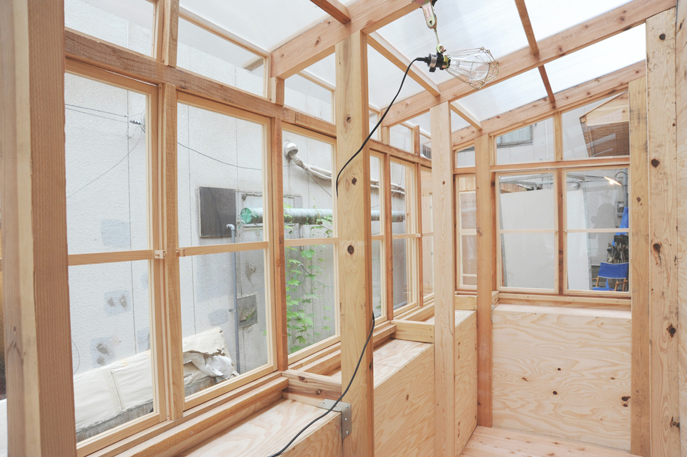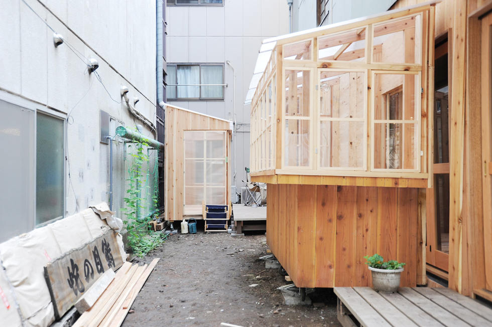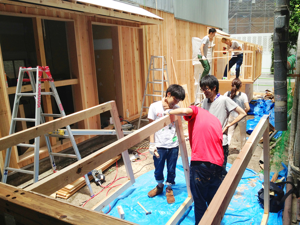 子供から大人まで「作ること」を共有できるイベントで作成した小屋。施工精度が低くても、空間の質を失わないような「大らかな納まり」を考えた。また隣のビルの一部のような片流れ屋根の形状にすることで、「路地」に似た場所を作り出し、敷地の狭さが楽しさに感じられるような計画にした。