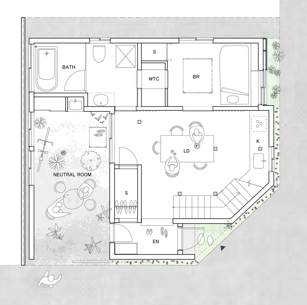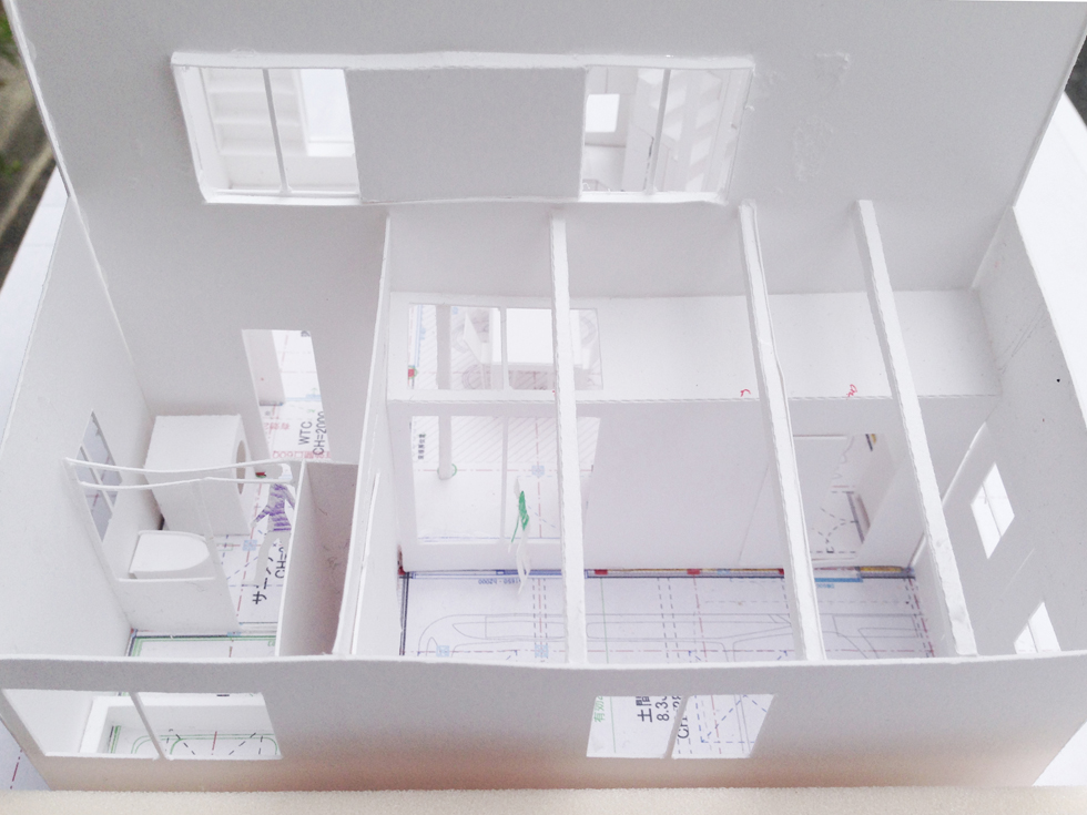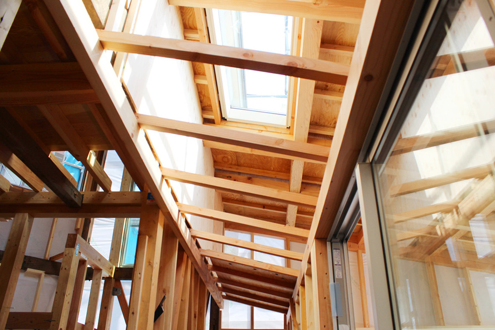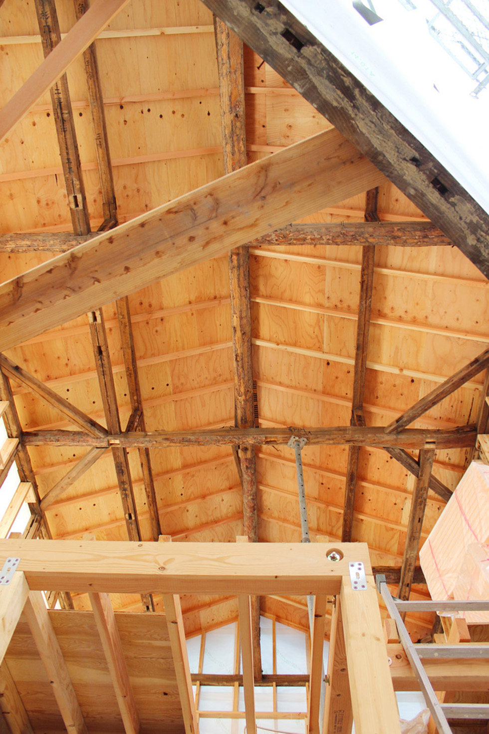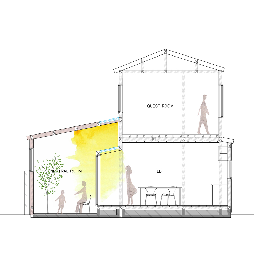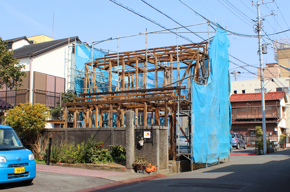 築50年の住宅の改修計画。建物の形状を残すということだけではなく、開口部・雨戸・庇・梁などの建物を構成する小さな部位を、改修後の住宅にも活かすことで、面影を残しながら街や人に記憶を繋ぐ家を計画した。