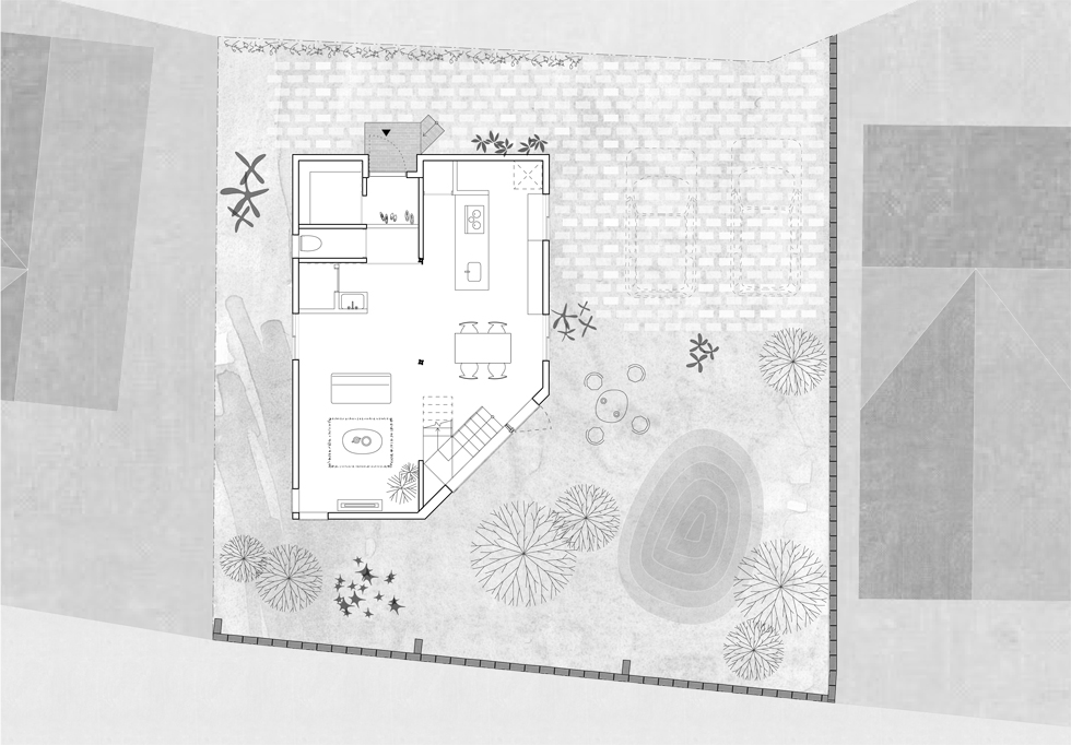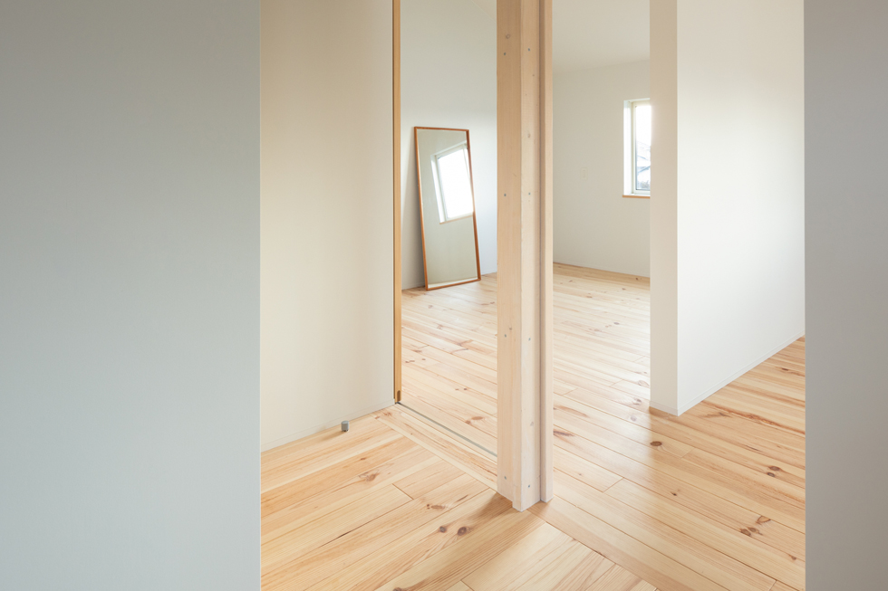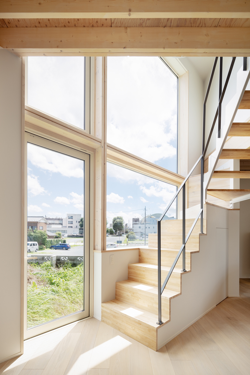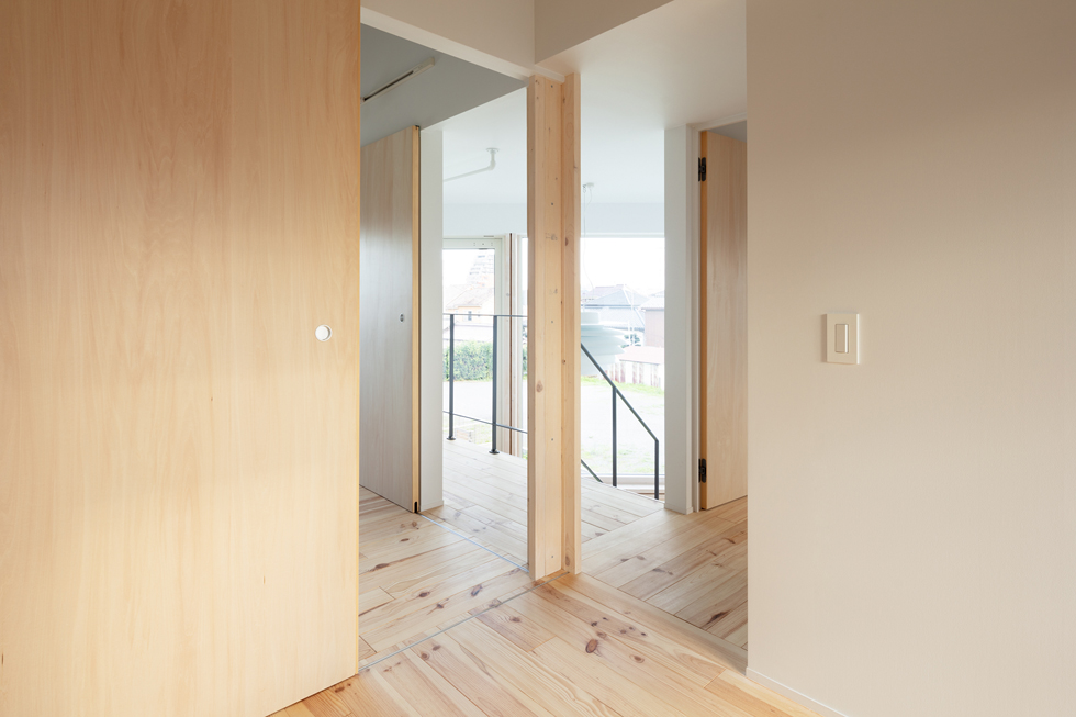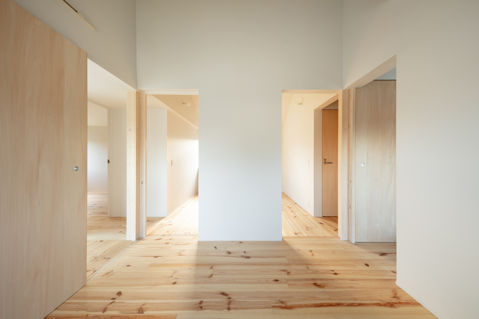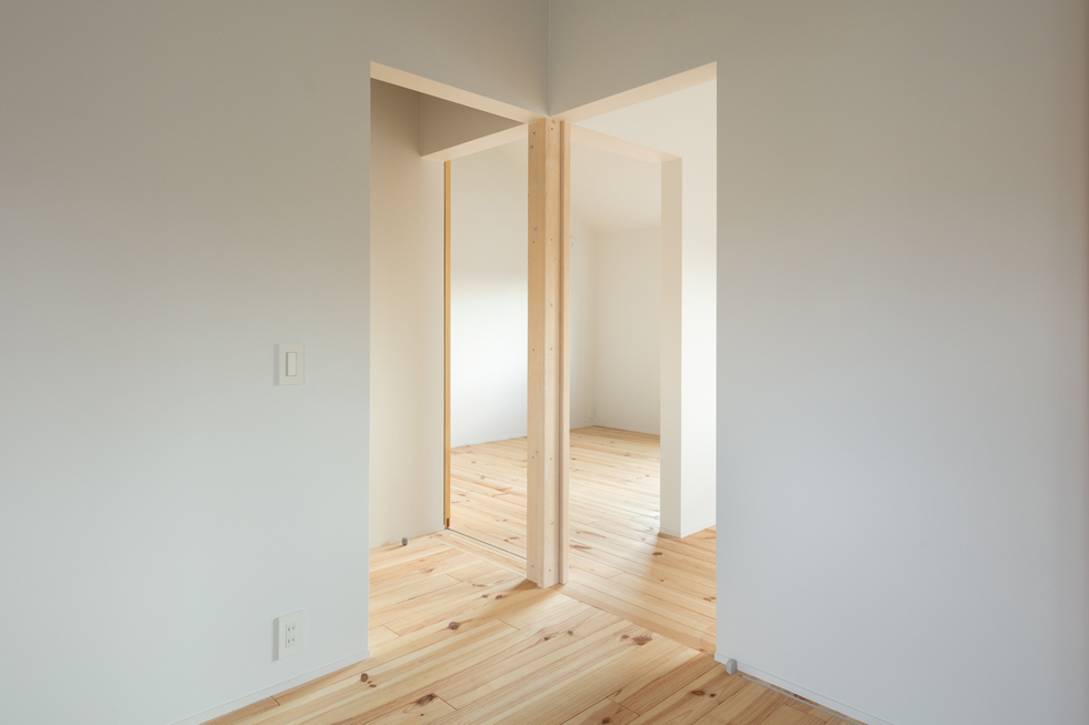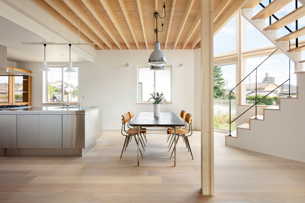 ヴィンテージの家具屋を営む建主からの要望は、家具のショールームを兼ねた大きなリビング空間であった。そこで、1階に可能な限り天井の高いワンルーム空間を設け、2階に4人家族が暮らすために必要な個室を集めた。 効率的な長方形の平面の一部を斜めにカットして大きな開口を設け、そこから入る大きな光の塊を、空間性の異なる1階と2階に分け与えている。また、斜めの開口部によって、庭と内部空間の密接な関係や隣地との適度な距離を獲得している。この住宅はツーバイ工法を採用し、2×4材を風車状に組み合わせた特徴的な卍柱が 2本、1,2階を貫いて現れている。この2つの卍柱を中心に各階の空間を構成し規律 を整えている。一方で卍柱には、規格化された小さな部材というツーバイ材の特徴を活かし、構造体から建具枠に至るスケールを横断した役割を与え、象徴性と身体性を持たせている。