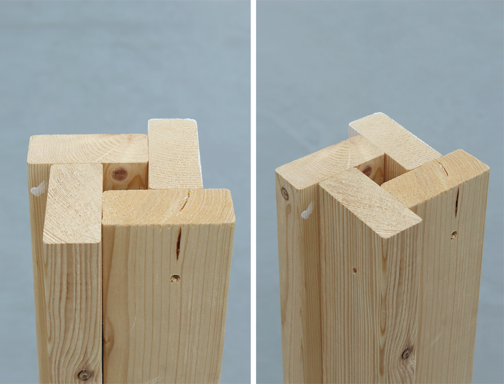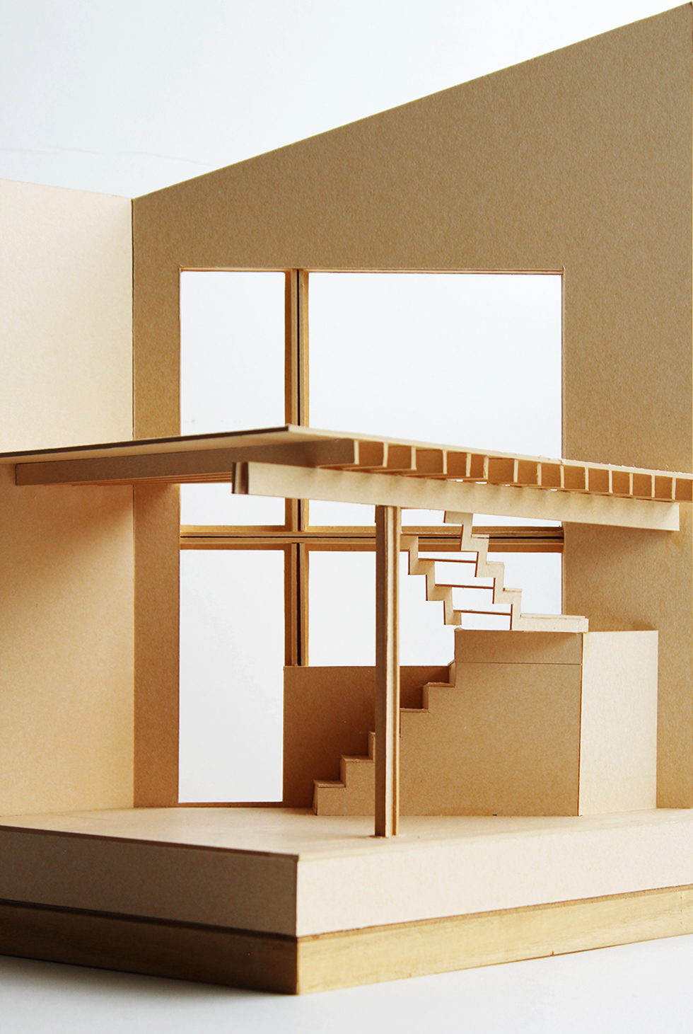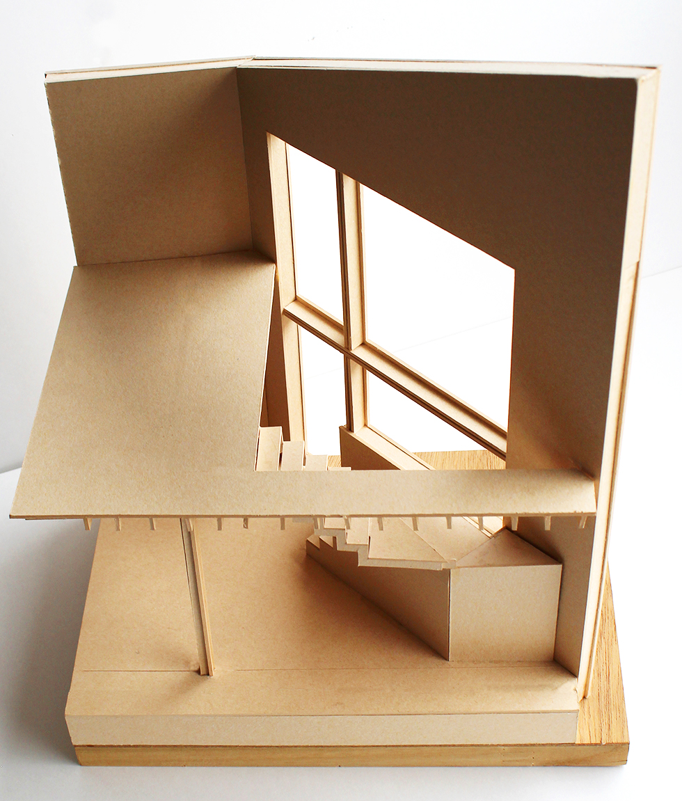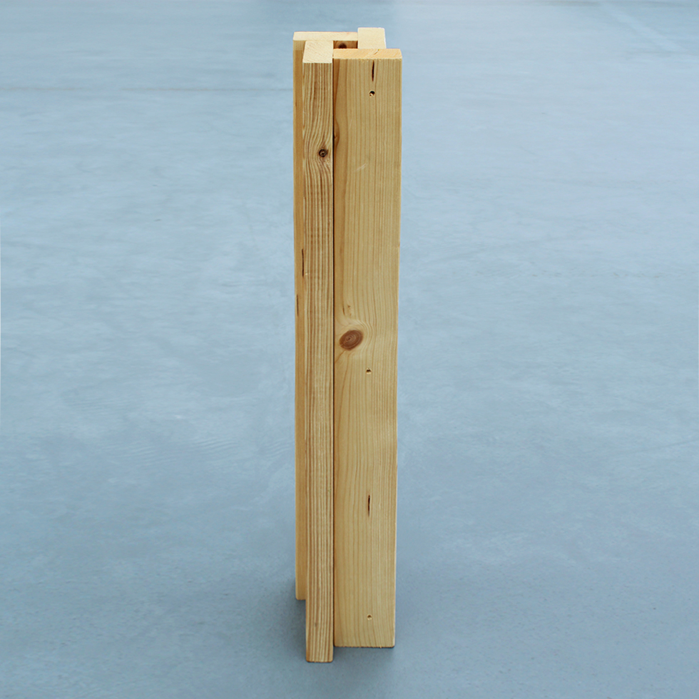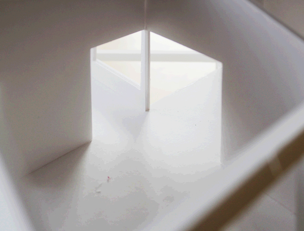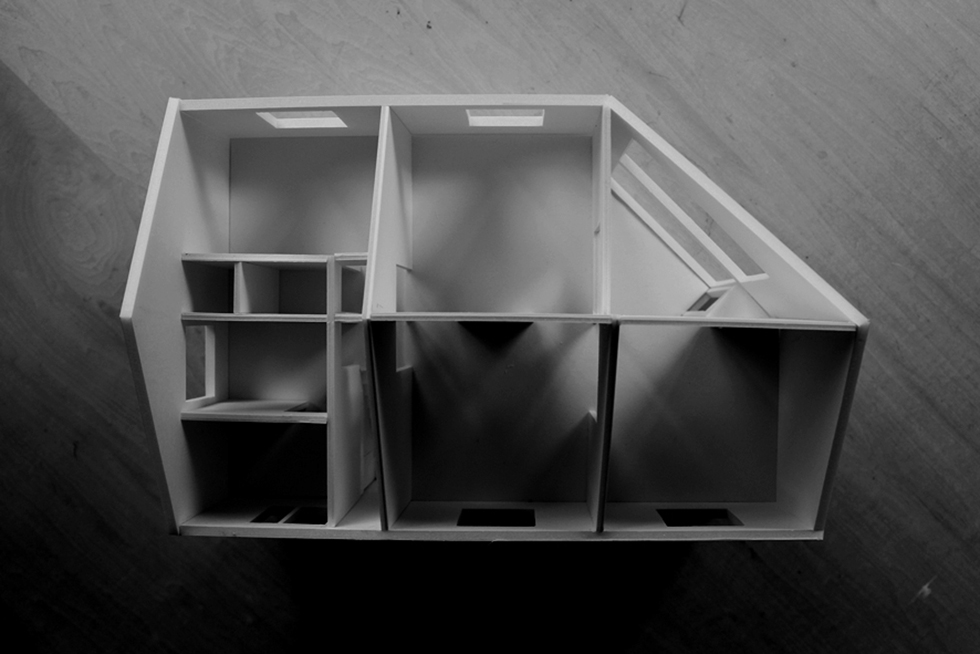ヴィンテージの家具屋を営む建主からの要望は、家具のショールームを兼ねた大きなリビング空間であった。そこで、1階に可能な限り天井の高いワンルーム空間を設け、2階に4人家族が暮らすために必要な個室を集めた。 効率的な長方形の平面の一部を斜めにカットして大きな開口を設け、そこから入る大きな光の塊を、空間性の異なる1階と2階に分け与えている。また、斜めの開口部によって、庭と内部空間の密接な関係や隣地との適度な距離を獲得している。この住宅はツーバイ工法を採用し、2×4材を風車状に組み合わせた特徴的な卍柱が 2本、1,2階を貫いて現れている。この2つの卍柱を中心に各階の空間を構成し規律 を整えている。一方で卍柱には、規格化された小さな部材というツーバイ材の特徴を活かし、構造体から建具枠に至るスケールを横断した役割を与え、象徴性と身体性を持たせている。