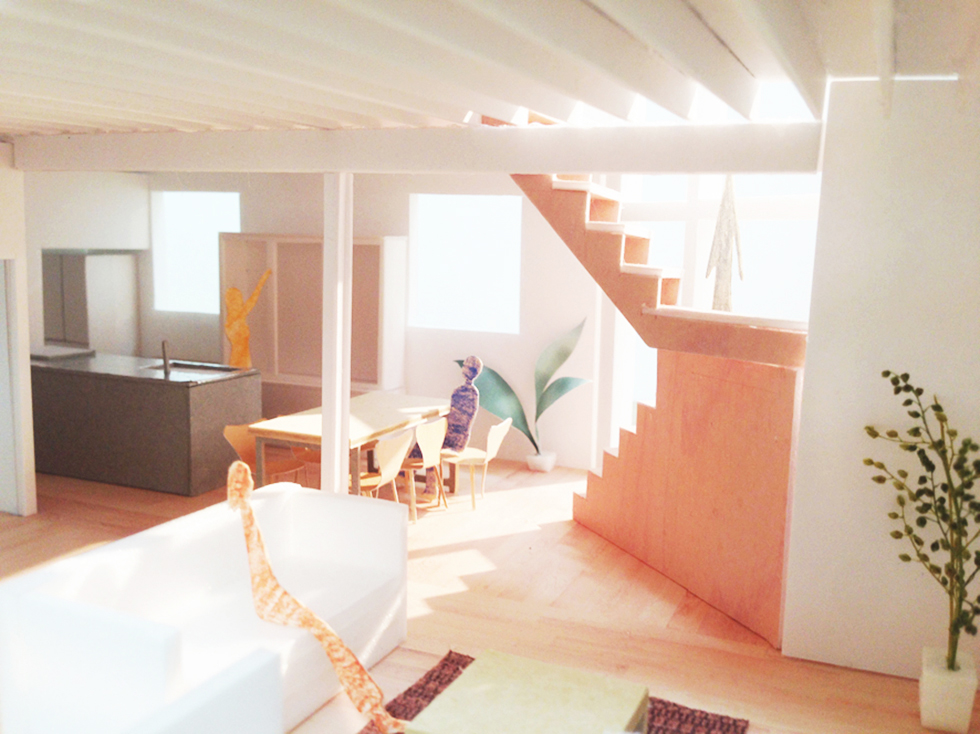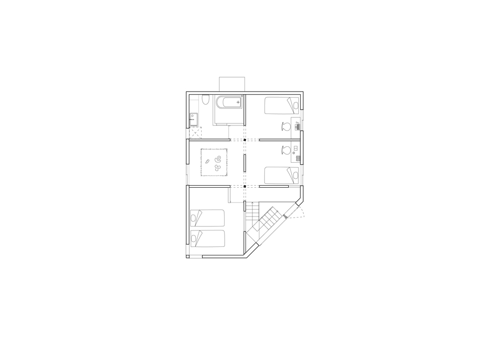 The request from the owner who runs a vintage furniture store was a large living space as a showroom for furniture.So what we thought was to create a one-room space with the highest ceiling as possible on the first floor, and to arrange the necessary rooms compactly for the family of four on the second floor.On an efficient rectangular plane, we cut part of it diagonally to make an opening. Large blocks of light coming from large diagonal openings are divided into the first and second floors with different spatiality.In addition, the diagonal openings make a closely relationship with the garden in the site and keep a appropriate distance from the neighborhood.