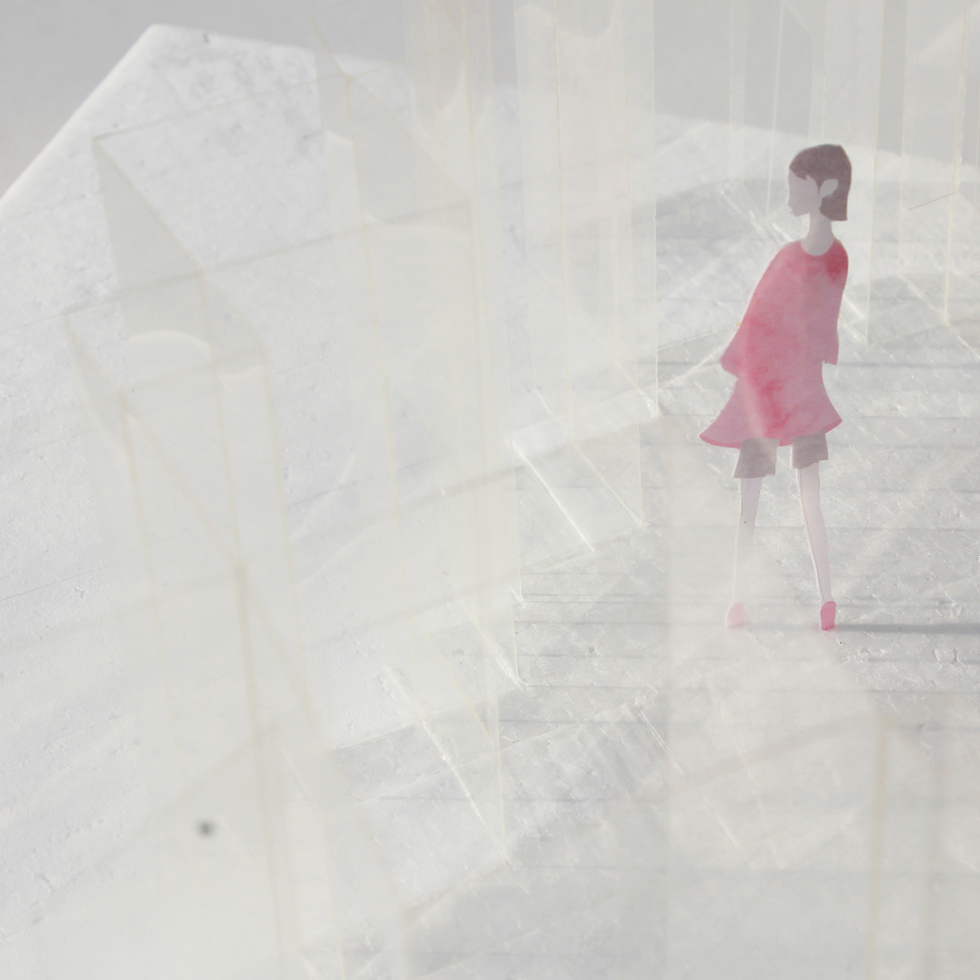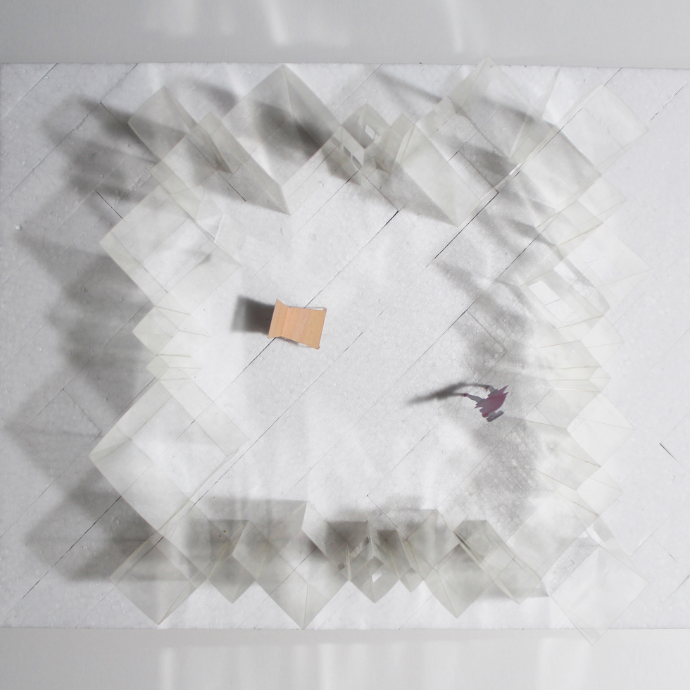 薄いガラスで作った小さな四角形を結晶のように繋ぎ、それによって生じた外壁表面の小さな斜めの集合が