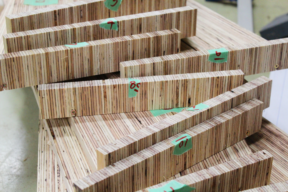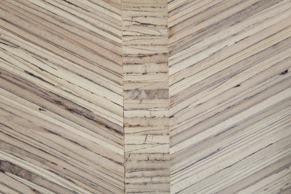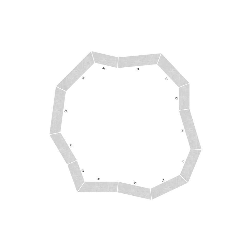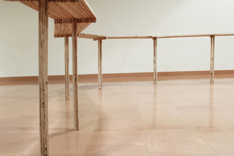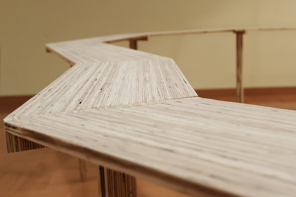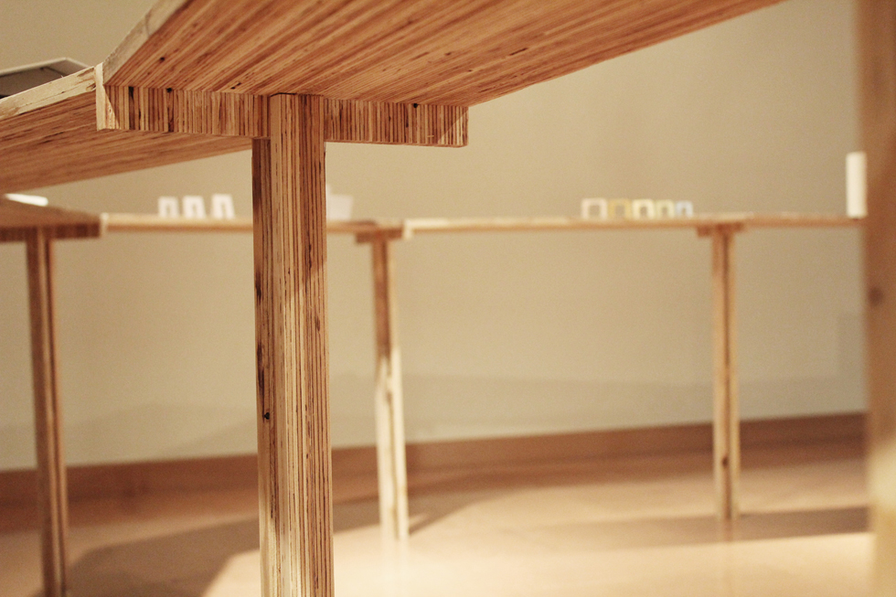 観客の動きがスムーズに流れるような「柔らかい多角形」のわずかな角度が、展示に対してそれぞれ正面を作り、繋がった平らな平面の上に領域を作り出す。素材はLVLを用い、「薄さと強さ」「積層の美しさ」などの特徴を持った展示台とした。