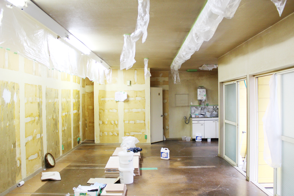 事務所の中心に4×8板2枚の大きなテーブルが置ける物件を探している中で、谷中にある木造アパートの隣接した2部屋を貸してくれる大家に出会った。部屋を借り受ける際に、改修の許可、現状復帰なし、隔壁撤去の承諾を得て契約を行った。