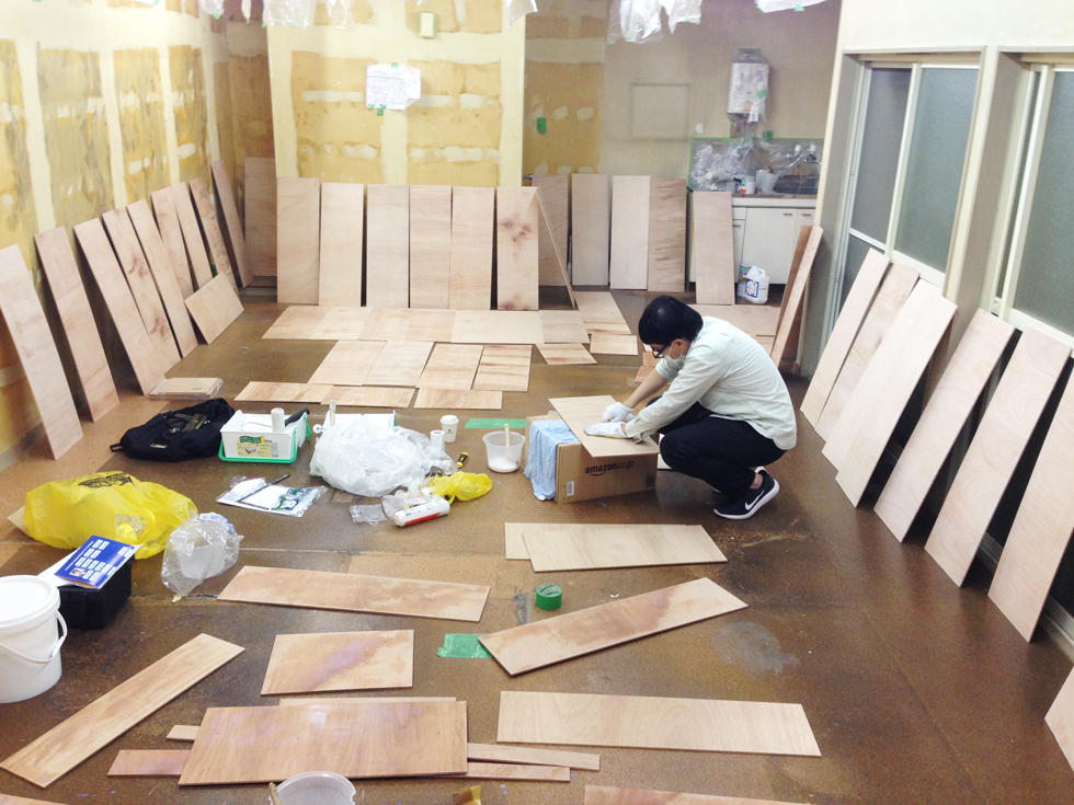 木造アパートであるため、短期間で静かな工事が求められた。そこで既存の床壁天井を残し、その上から施工できる手法を採用した。また詳細な測量を行い、ホームセンターで調達・加工できる素材で図面を作成し、現場ではそれを取り付けるだけの計画を行った。