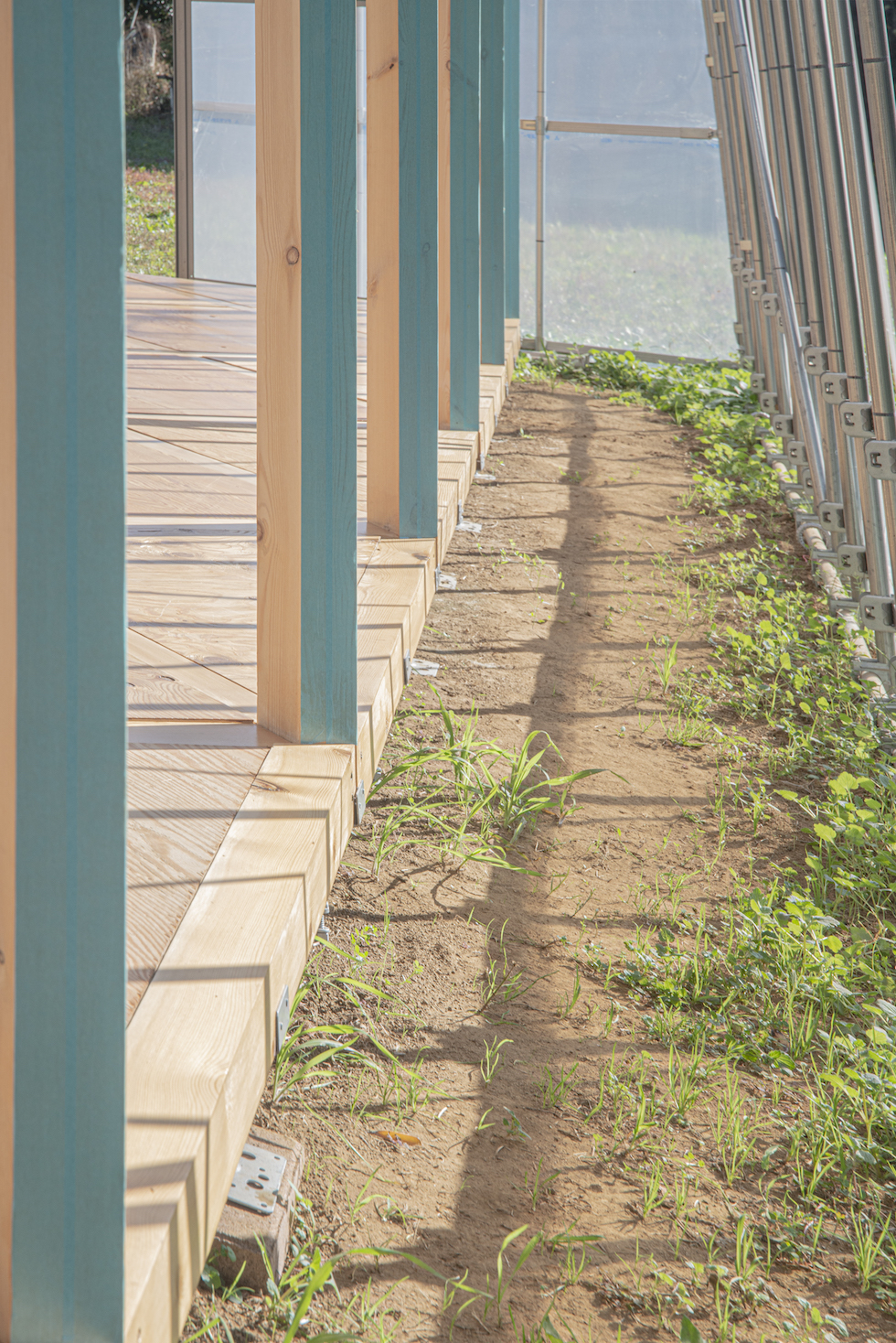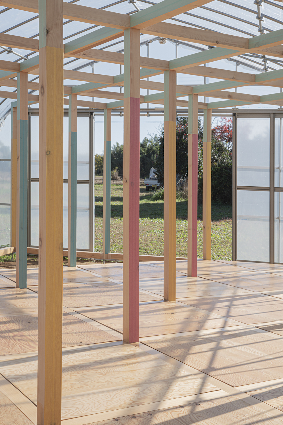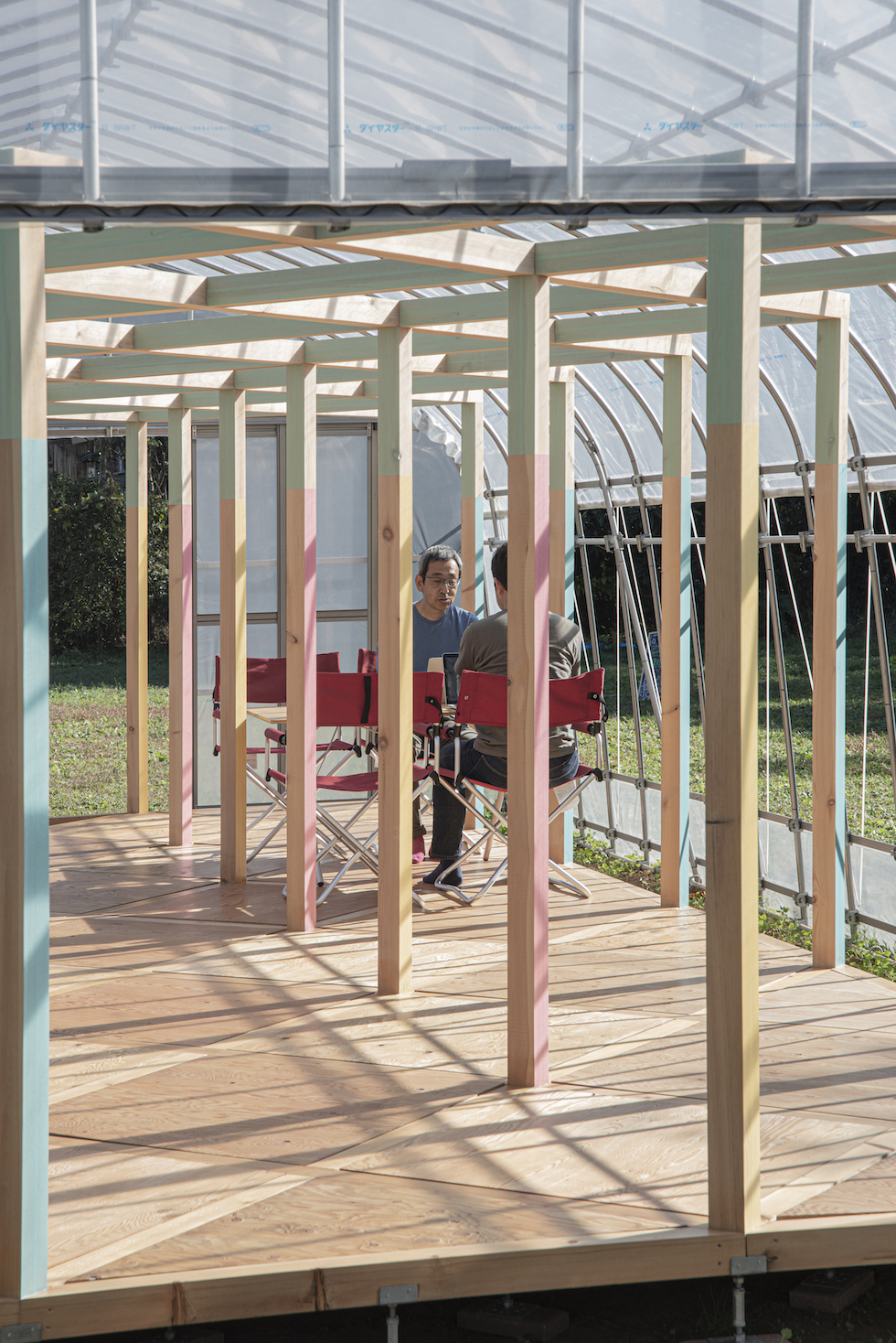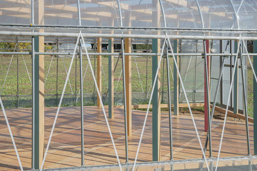 この計画を進めるにあたり「技術的に再現性が高く安価に作れる」ことが大切だと考え、着目したのがビニールハウスであった。機能美に優れているのはもちろん、透明で軽やかで農地の風景の一部になっているこの要素を活かしたいと考えた。 ビニールハウスのモジュールに呼応するような幾何学を持つ構築物を内部に計画することで、ビニールハウスが内包するのびやかな空間性を活かしながら、人の居場所を同時に存在させるような仕組みを作った。また透明で薄い膜を外皮に持つことで、通常の建築とは違う生き生きとした空間が立ち現れたように思えた。 構法としては、赤松KD材75mm角で作られたフレームに構造用合板24mmの床を落とし込む簡素なディテールとすることで、組立てを簡素化し、数年に一度起こる水害に備え解体を短時間で行えるように工夫した。またこのフレームを手がかりに使い手が間仕切りや屋根を簡単に取り付けられる仕組みとした。