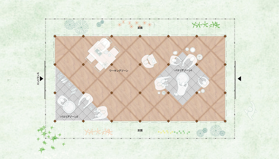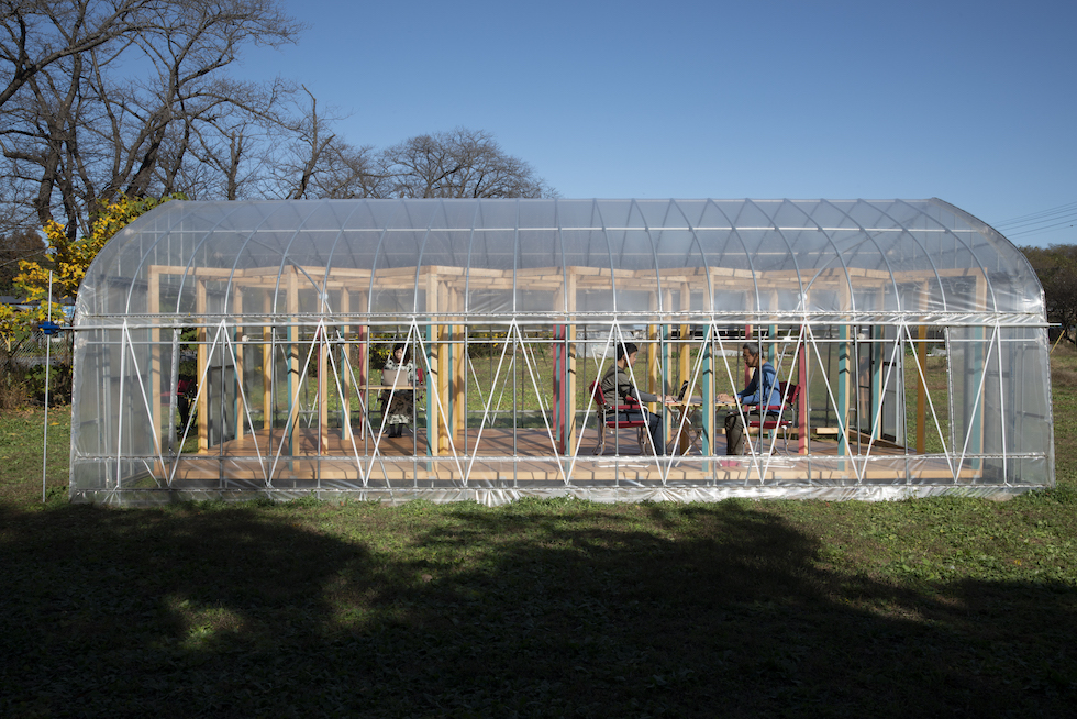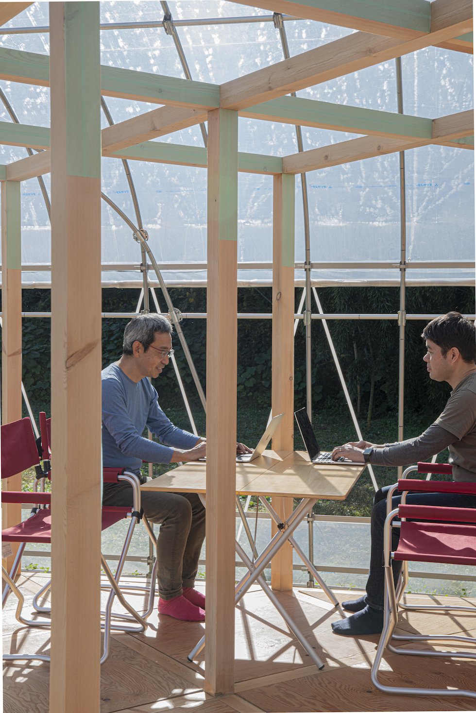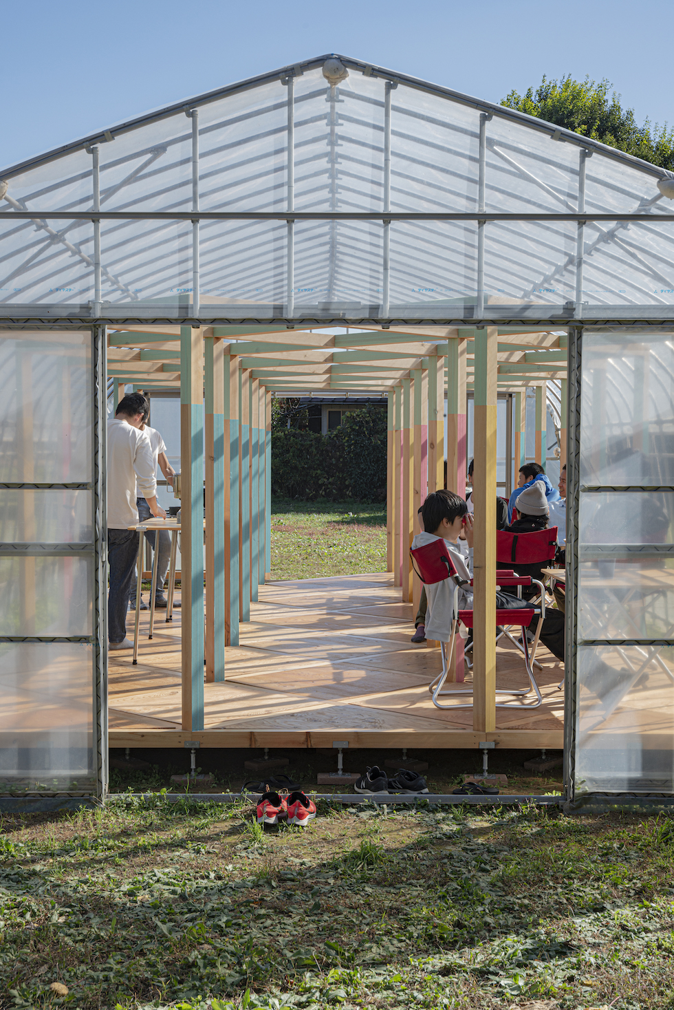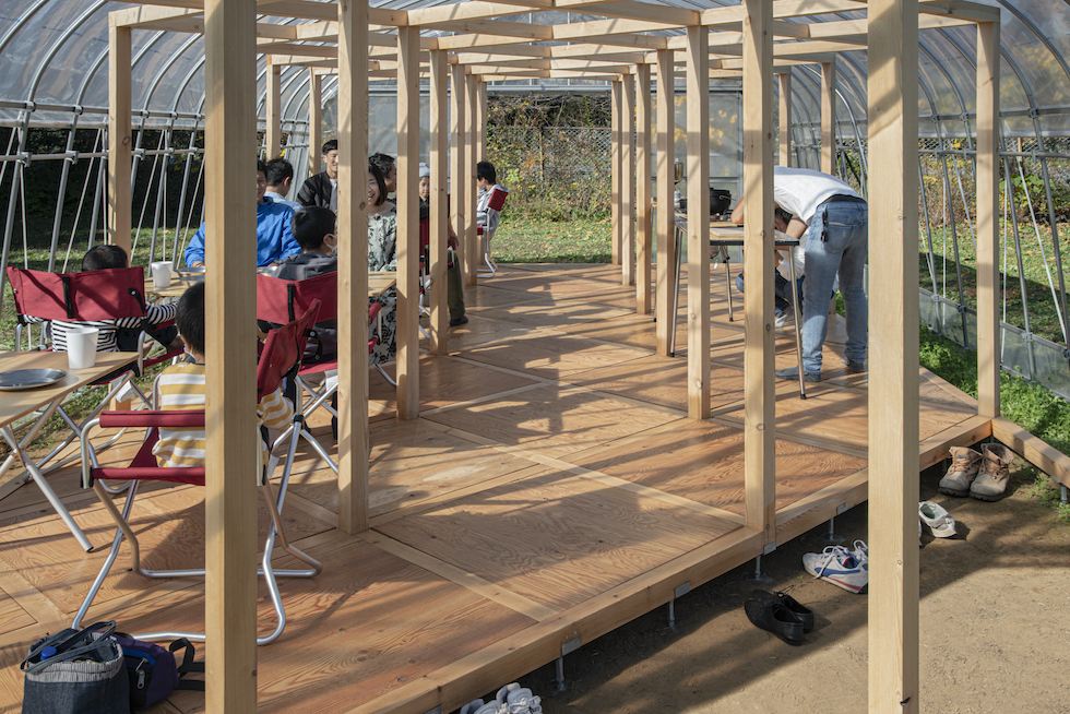 この計画を進めるにあたり「技術的に再現性が高く安価に作れる」ことが大切だと考え、着目したのがビニールハウスであった。機能美に優れているのはもちろん、透明で軽やかで農地の風景の一部になっているこの要素を活かしたいと考えた。 ビニールハウスのモジュールに呼応するような幾何学を持つ構築物を内部に計画することで、ビニールハウスが内包するのびやかな空間性を活かしながら、人の居場所を同時に存在させるような仕組みを作った。また透明で薄い膜を外皮に持つことで、通常の建築とは違う生き生きとした空間が立ち現れたように思えた。 構法としては、赤松KD材75mm角で作られたフレームに構造用合板24mmの床を落とし込む簡素なディテールとすることで、組立てを簡素化し、数年に一度起こる水害に備え解体を短時間で行えるように工夫した。またこのフレームを手がかりに使い手が間仕切りや屋根を簡単に取り付けられる仕組みとした。