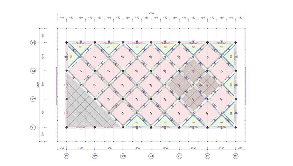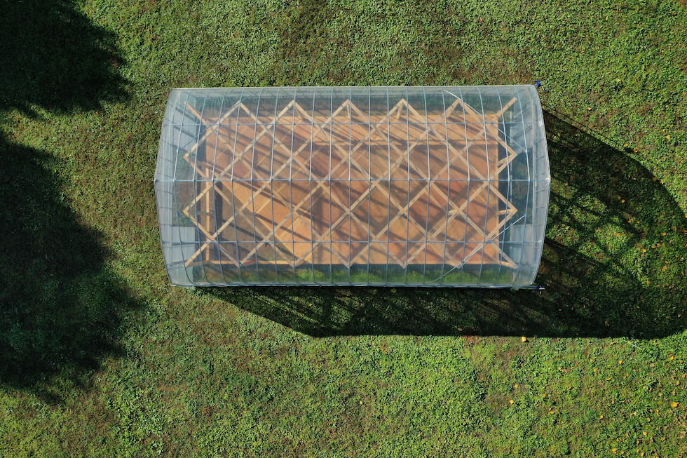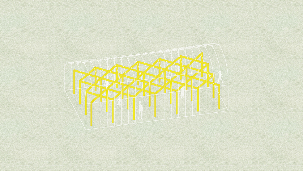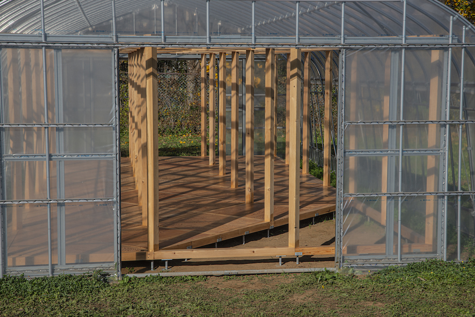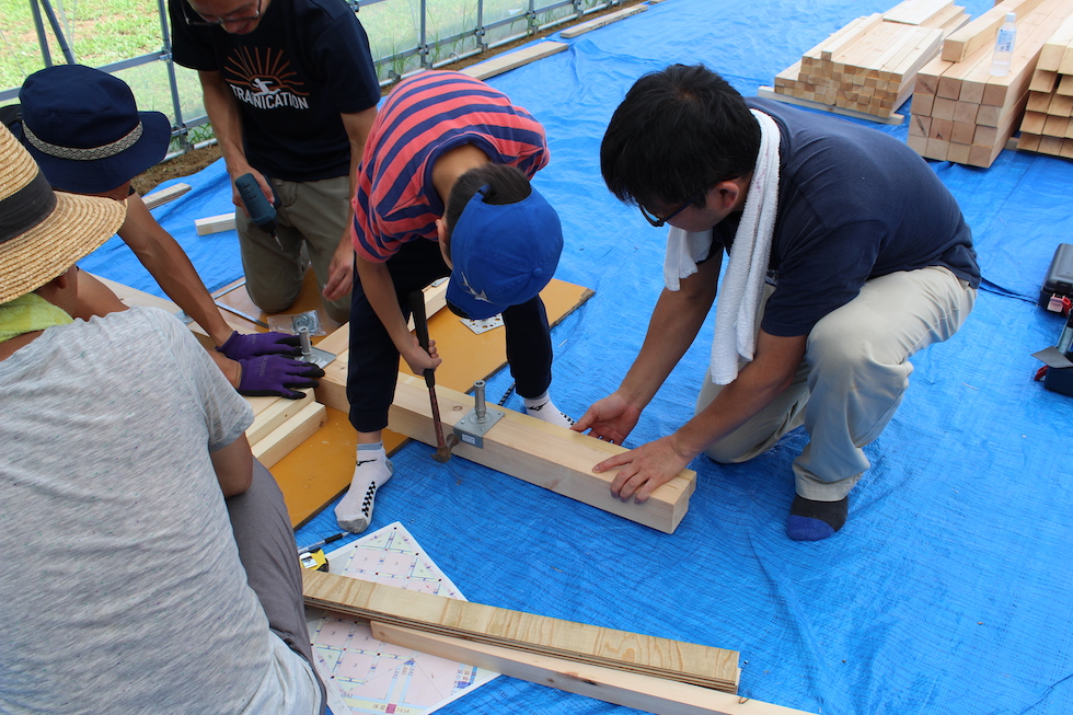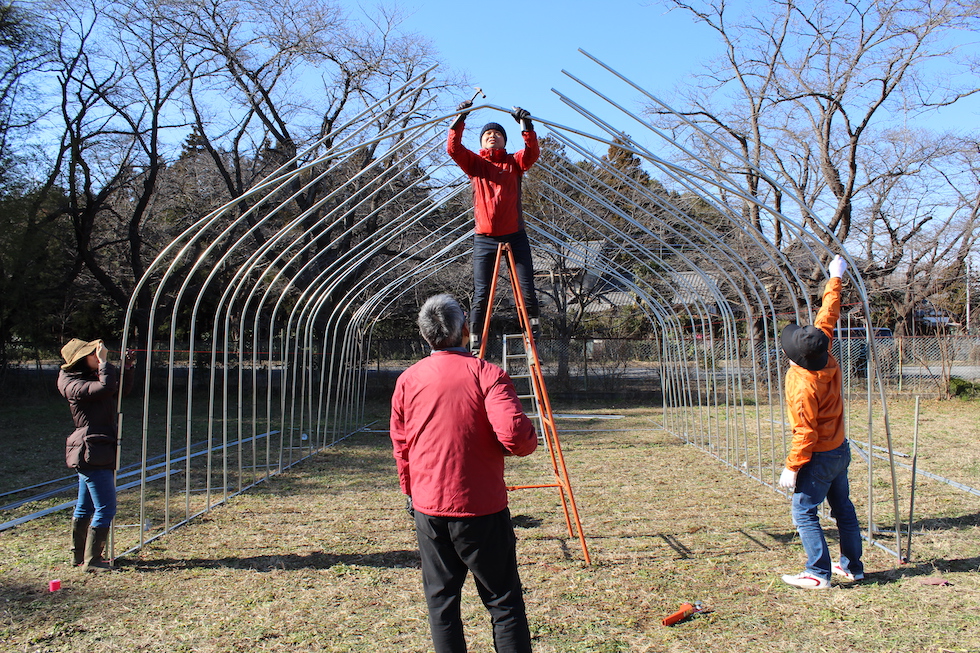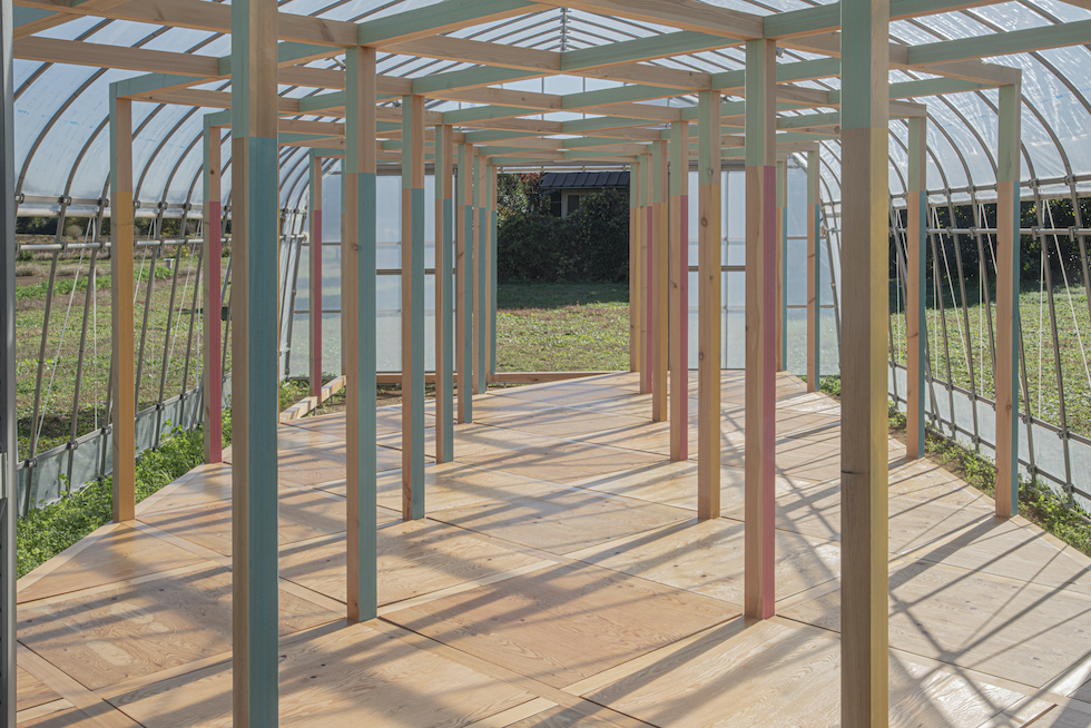 この計画を進めるにあたり「技術的に再現性が高く安価に作れる」ことが大切だと考え、着目したのがビニールハウスであった。機能美に優れているのはもちろん、透明で軽やかで農地の風景の一部になっているこの要素を活かしたいと考えた。 ビニールハウスのモジュールに呼応するような幾何学を持つ構築物を内部に計画することで、ビニールハウスが内包するのびやかな空間性を活かしながら、人の居場所を同時に存在させるような仕組みを作った。また透明で薄い膜を外皮に持つことで、通常の建築とは違う生き生きとした空間が立ち現れたように思えた。 構法としては、赤松KD材75mm角で作られたフレームに構造用合板24mmの床を落とし込む簡素なディテールとすることで、組立てを簡素化し、数年に一度起こる水害に備え解体を短時間で行えるように工夫した。またこのフレームを手がかりに使い手が間仕切りや屋根を簡単に取り付けられる仕組みとした。