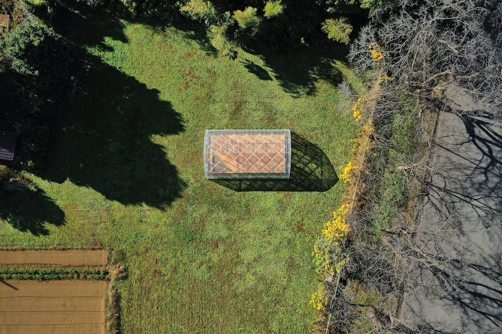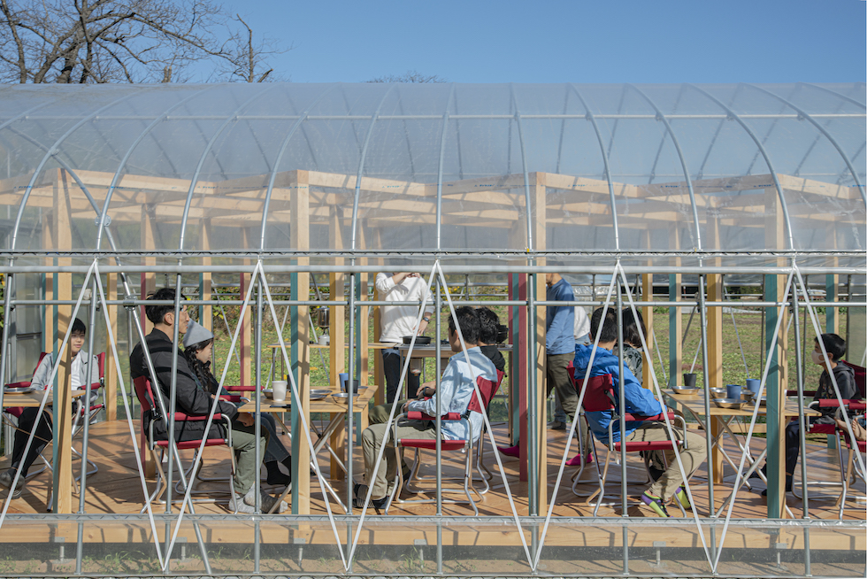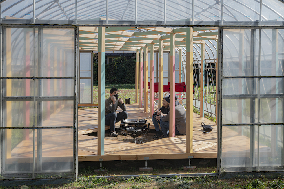 The client's request was to create a place for people to mingle and co-creation using idle farmland owned in Inzai City, Chiba Prefecture. Hearing this, I thought it would be interesting to create a plan that would increase the attractiveness of farmland at a time when more and more young people are starting to live in two locations or start farming. In order to proceed with this plan, I thought it was important to have "technically reproducible and inexpensive to make", and I focused on vinyl greenhouses. We wanted to take advantage of this element, which is not only functional and beautiful, but also transparent and light, and has become a part of the farmland landscape. By planning the interior with geometric structures that correspond to the modules of the vinyl house, I created a system that allows people to be in their place at the same time as taking advantage of the spaciousness of the vinyl house. Also, by using a transparent and thin membrane as the outer skin, a lively space that is different from ordinary architecture seems to have emerged. The frame is made of 75mm square red pine wood, and the floor is made of 24mm structural plywood. The frame is also used as a clue for users to easily attach partitions and roofs. This place, which we named "GREEN BASE" is not only used as a work space for farming, but also for cooking and partying with vegetables harvested from the surrounding fields, holding concerts under the blue sky, and remote work in the pleasant rustle of trees. In an age where new ways of working are being questioned, how wonderful it would be to have a second place where you can express yourself,and I hope that GREEN BASE can be a prototype for this.