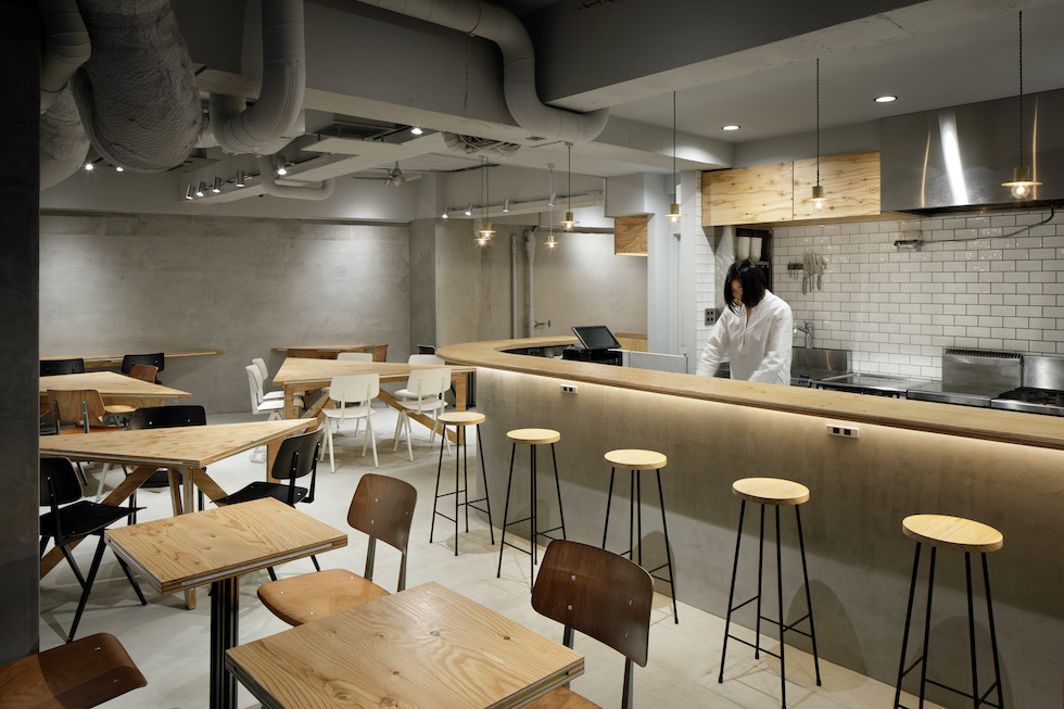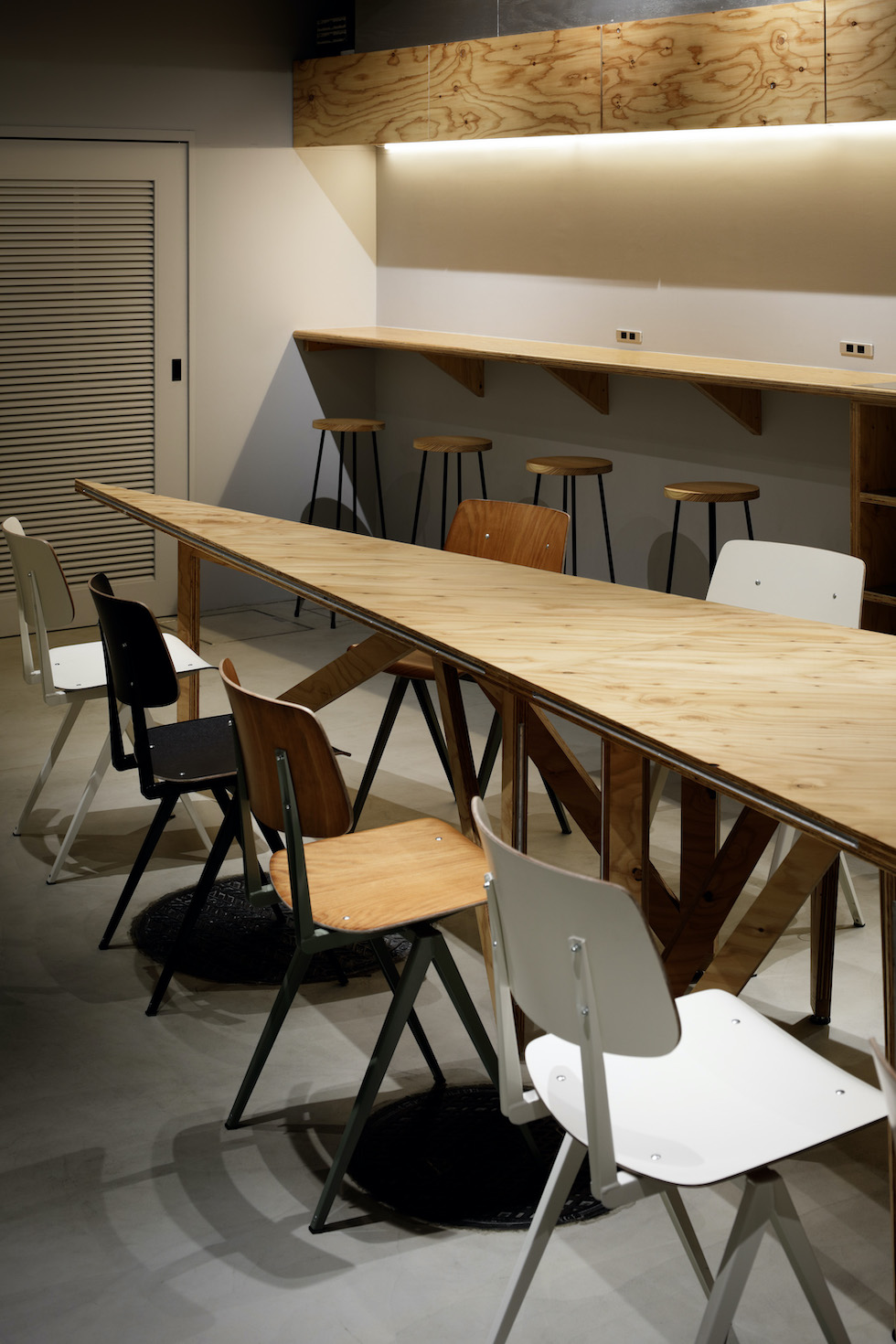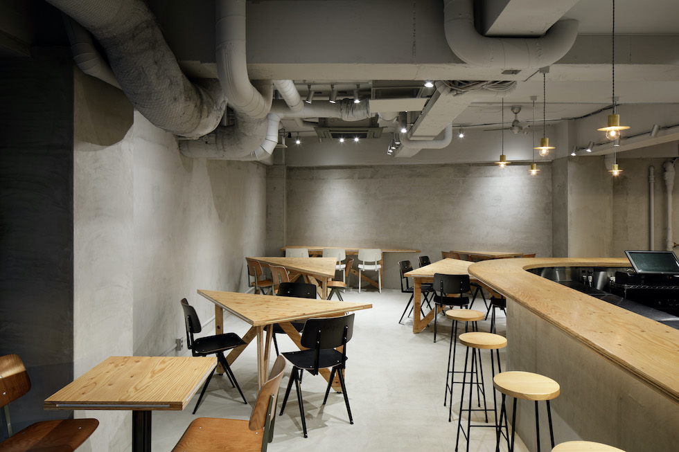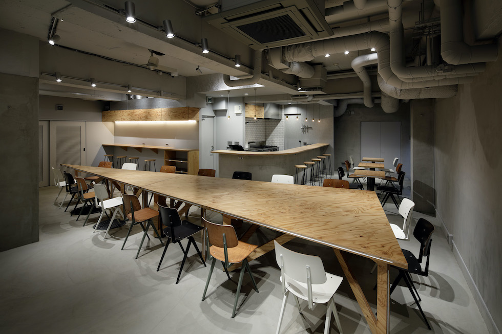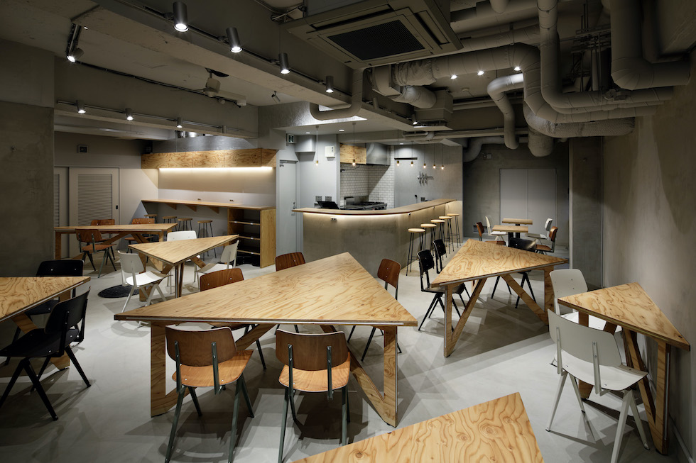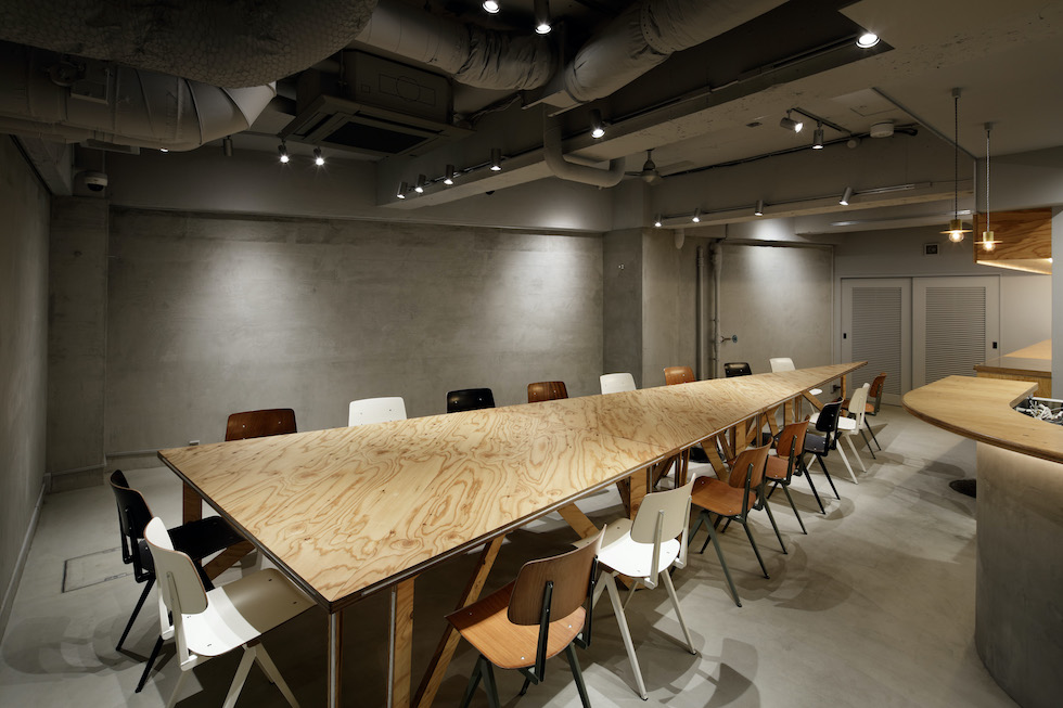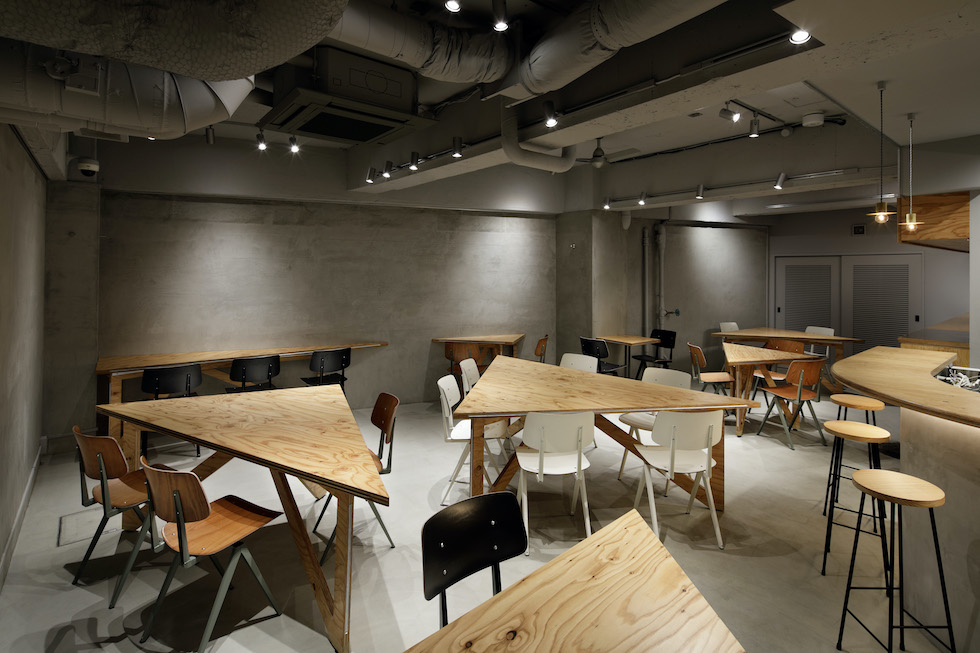 We planned to renovate the basement of a construction company with 80 years of history in Sendagaya to create a company cafeteria space open to the community. When not in use as a cafeteria, the space is used for company meetings and community events. It was required to be a base for various people to collaborate. We planned a large triangular table that corresponds to the angle of the existing frame. By dividing the table into smaller triangles, we were able to randomly arrange the seats. One of the characteristics of the triangular table is that the people seated face to face or on the wall are displaced from the front, which creates a variety of eye contact and creates a relaxed impression. By going beyond its function as a piece of furniture and incorporating its size and randomness into the space The idea was to create an impression of the entire space. The way the furniture is used in a non-uniform way itself is expressed as a landscape with fun and movement. The goal was to create a place that would be familiar to employees and residents.