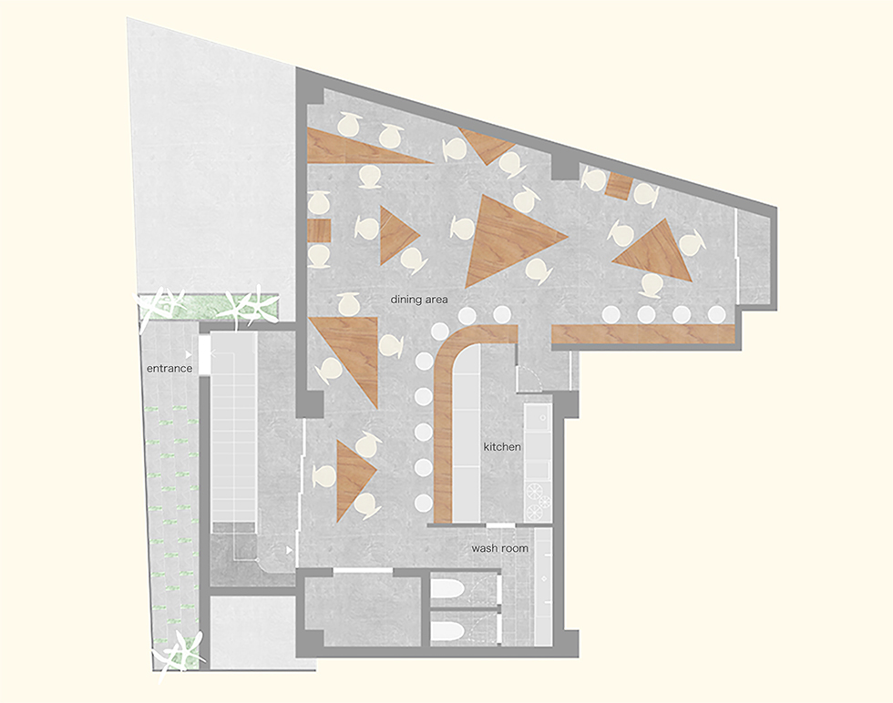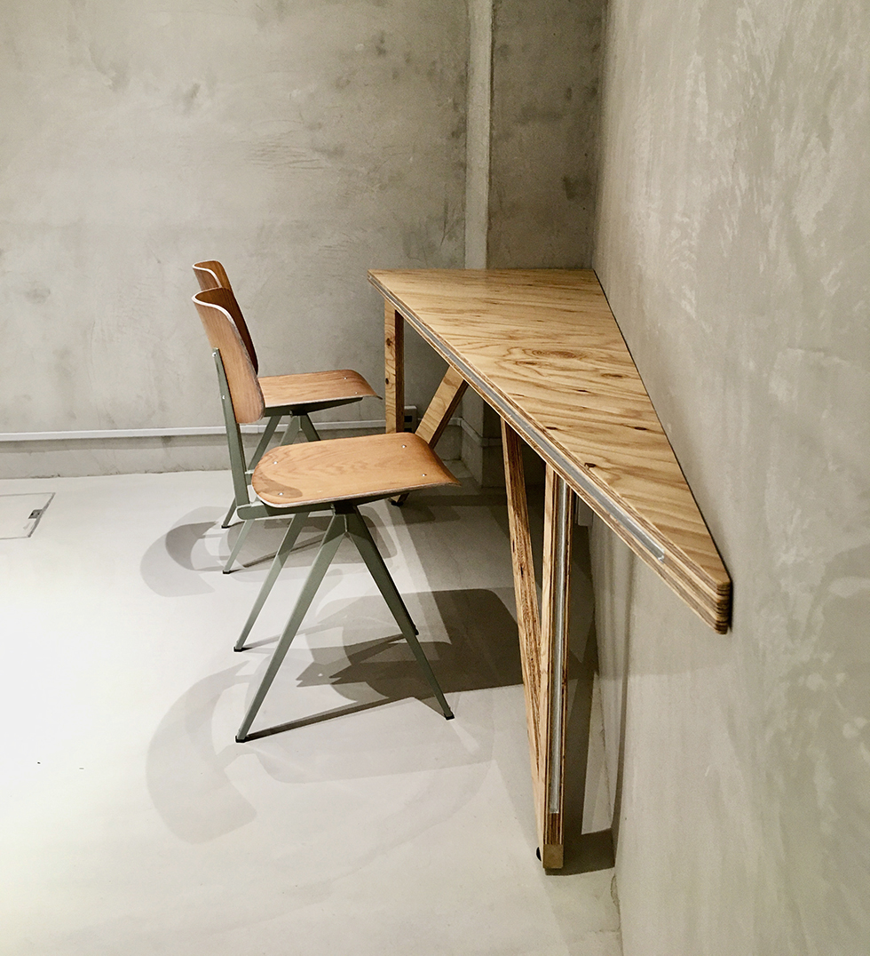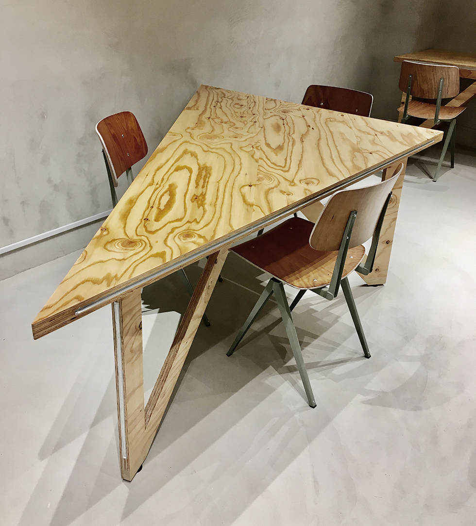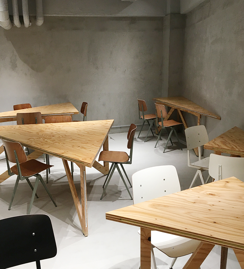 千駄ヶ谷で約80年の歴史を持つ松田建設工業の地下を改修して、地域に開いた社員食堂スペースを計画しました。この場所は平日の昼間は社員や地域の人々が利用できる食堂として使用され、それ以外の時間帯は社内ミーティングや地域のイベントスペースとして様々な人が利用できる場所となっています。計画としては既存躯体の角度に呼応するようなとても大きな三角形のテーブルを考えました。そのテーブルを細かい三角形に分割することで、座席をランダムに配置できるような仕組みとしました。三角形のテーブルの特徴として、座ったときに対面に向き合う壁や人との正対関係が特有の角度を持ってズレるため、様々な視線の交錯が生じます。そこに座ったときに予期せぬ関係性が自由さを感じさせ、不思議と心地よさを作り出すことができたのは面白い発見でした。家具としての機能を少しだけ拡張し、大きなスケール感やランダム感などを空間に取り込むことで空間全体の印象に彩りを生み出しました。画一的ではない使われ方そのものが楽しさや動きのある風景として表出し、社員や地域住民に親しまれる場所となることを目指しました。