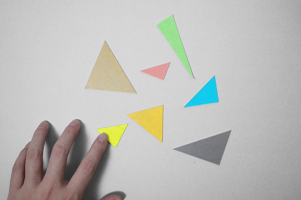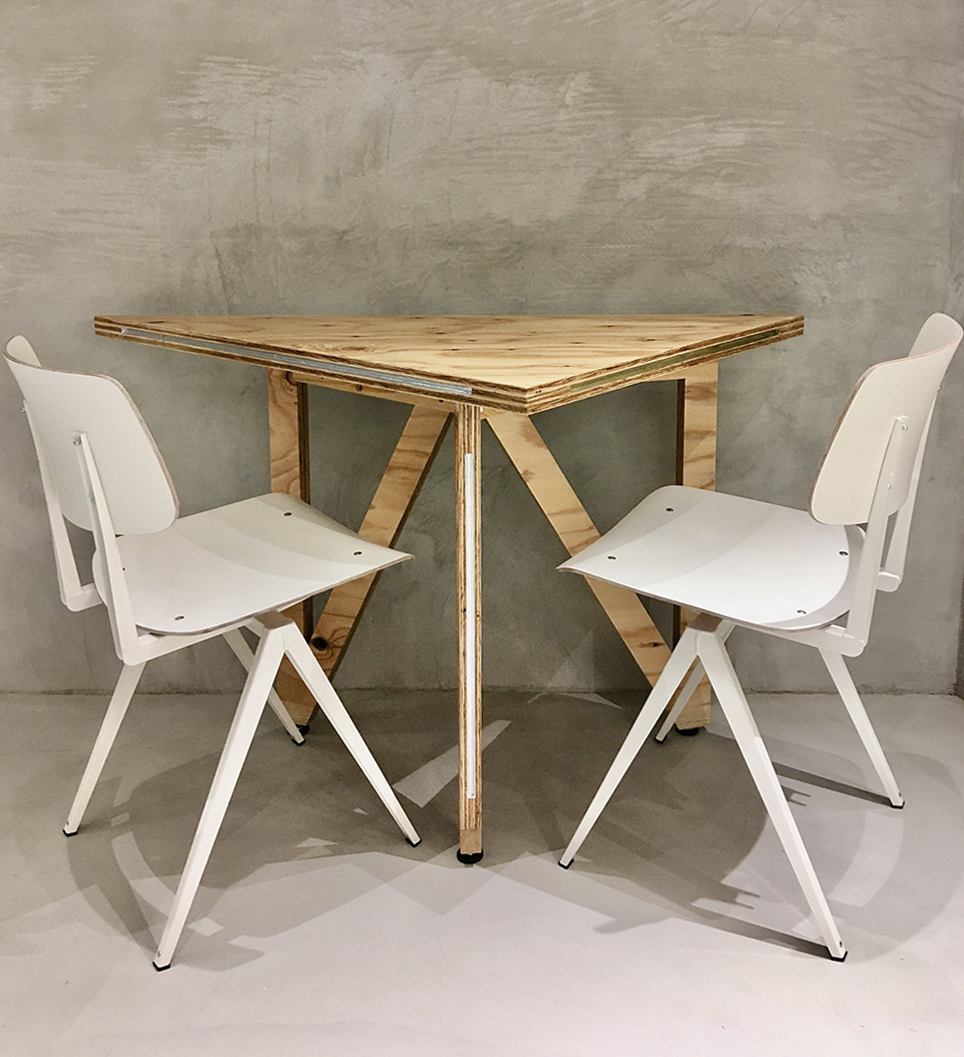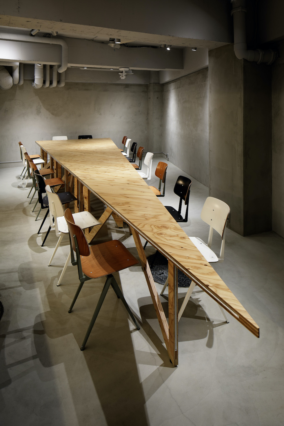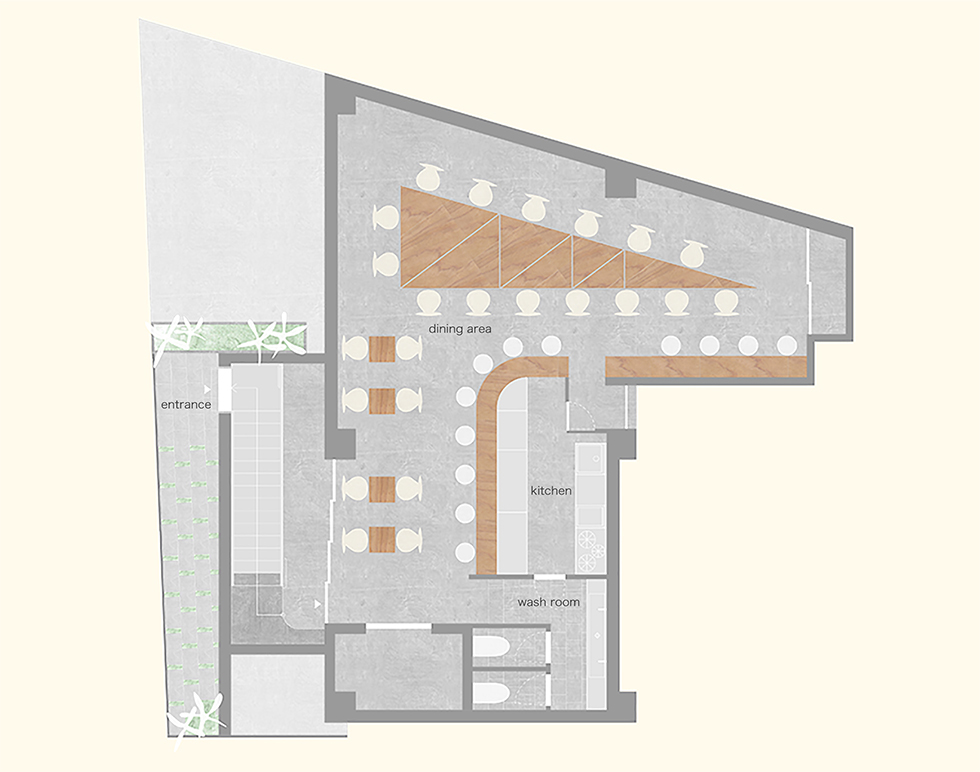 千駄ヶ谷で約80年の歴史を持つ松田建設工業の地下を改修して、地域に開いた社員食堂スペースを計画しました。この場所は平日の昼間は社員や地域の人々が利用できる食堂として使用され、それ以外の時間帯は社内ミーティングや地域のイベントスペースとして様々な人が利用できる場所となっています。計画としては既存躯体の角度に呼応するようなとても大きな三角形のテーブルを考えました。そのテーブルを細かい三角形に分割することで、座席をランダムに配置できるような仕組みとしました。三角形のテーブルの特徴として、座ったときに対面に向き合う壁や人との正対関係が特有の角度を持ってズレるため、様々な視線の交錯が生じます。そこに座ったときに予期せぬ関係性が自由さを感じさせ、不思議と心地よさを作り出すことができたのは面白い発見でした。家具としての機能を少しだけ拡張し、大きなスケール感やランダム感などを空間に取り込むことで空間全体の印象に彩りを生み出しました。画一的ではない使われ方そのものが楽しさや動きのある風景として表出し、社員や地域住民に親しまれる場所となることを目指しました。