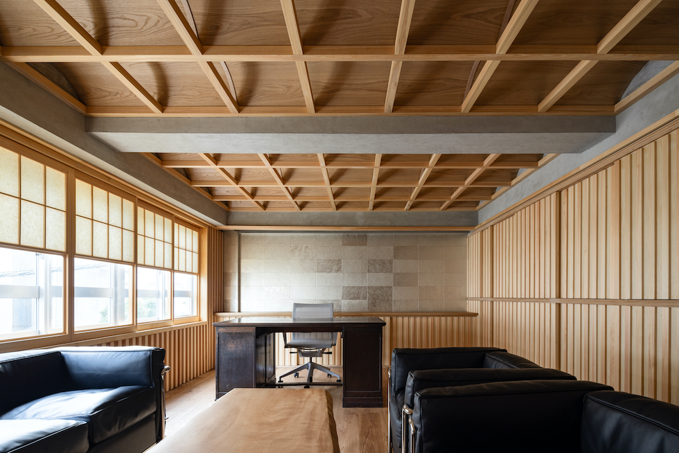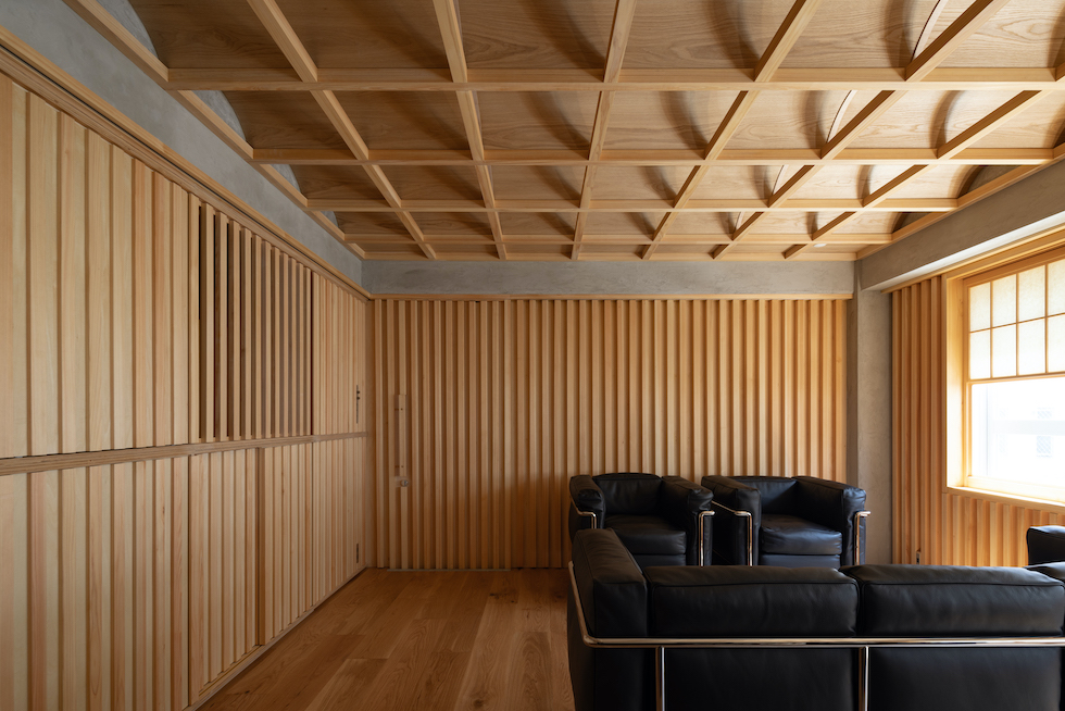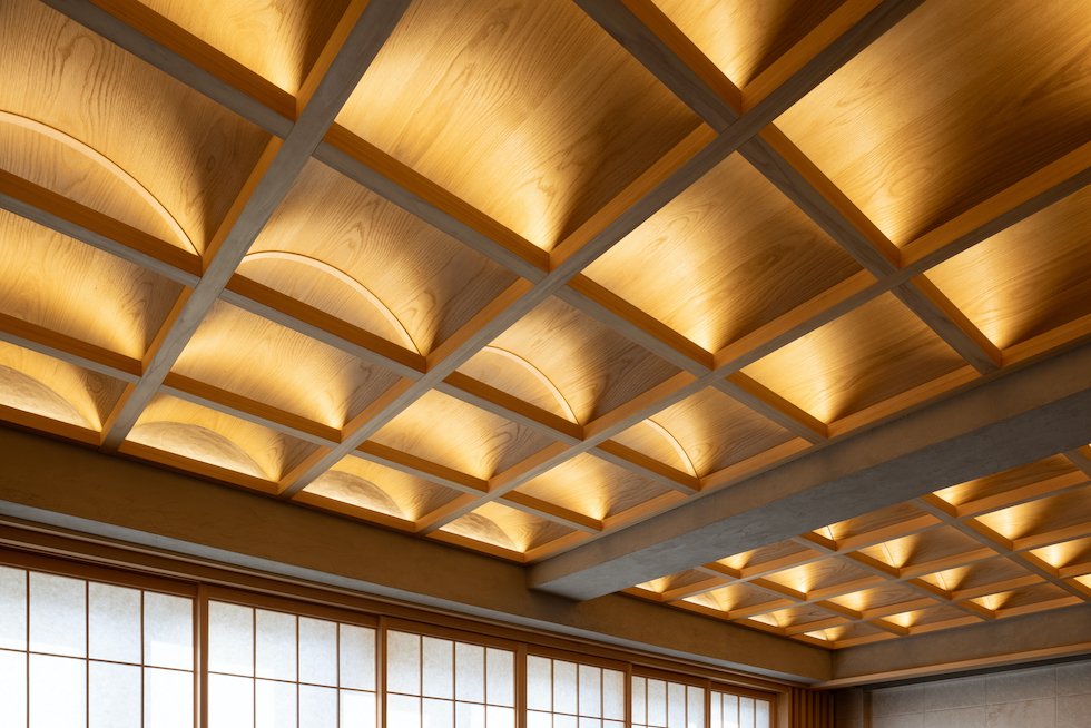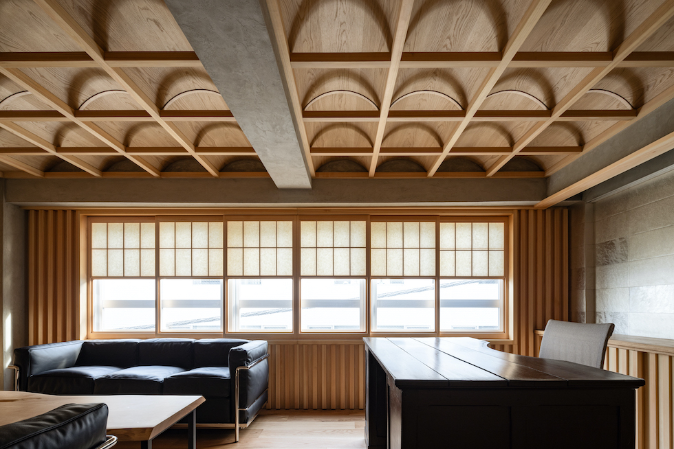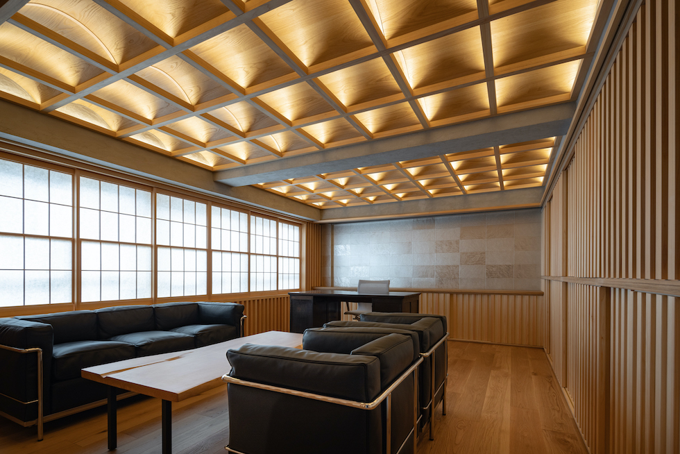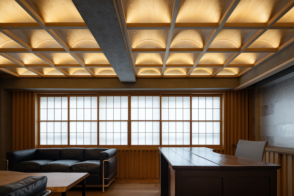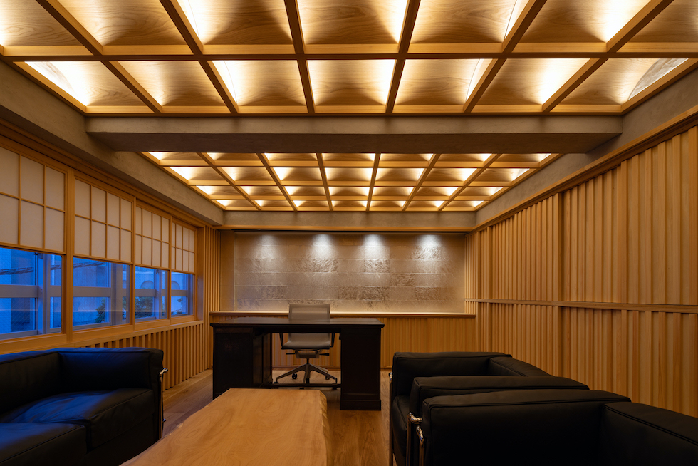 クライアントの要望であった「雪見障子」の柔らかい光を受け止める装置としてヴォールト形状が反復するような奥行きを持った格天井を計画した。このヴォールト形状の天井面に時間や天候によって移ろう美しい陰影を映し出すことで、その現象自体が社長室としての格式を表現したいと考えた。夜には天井全体が照明装置として機能し空間全体を演出する。