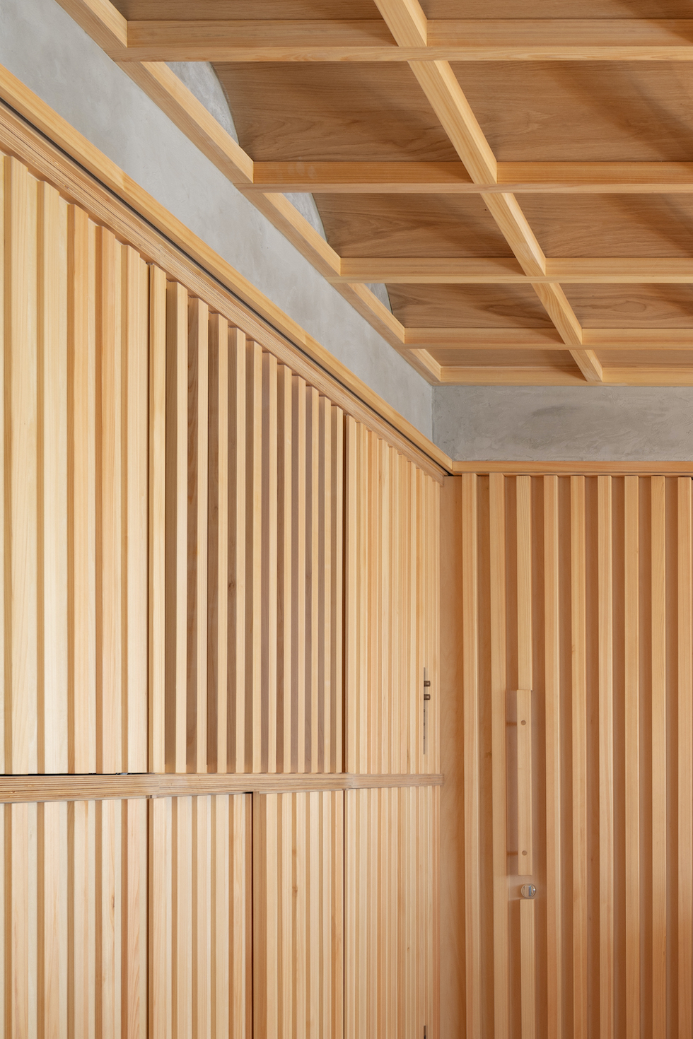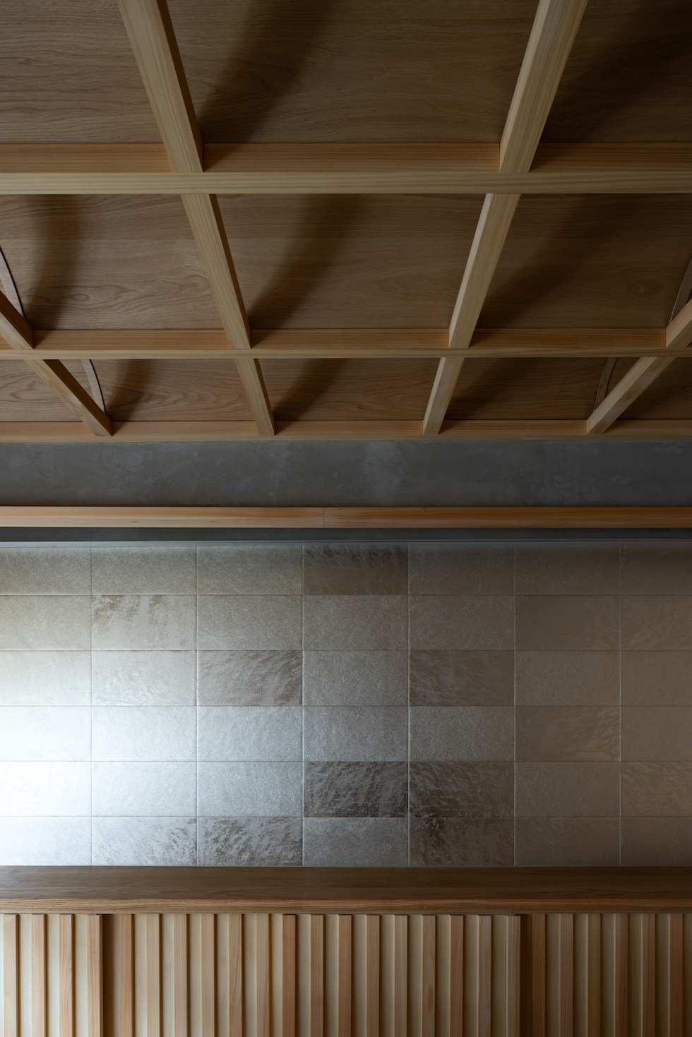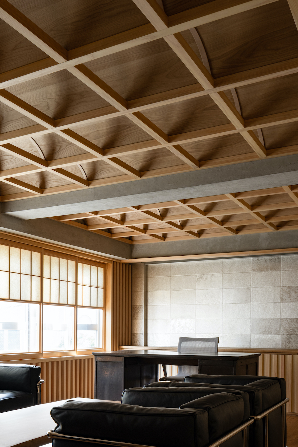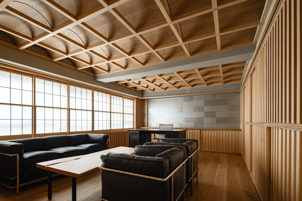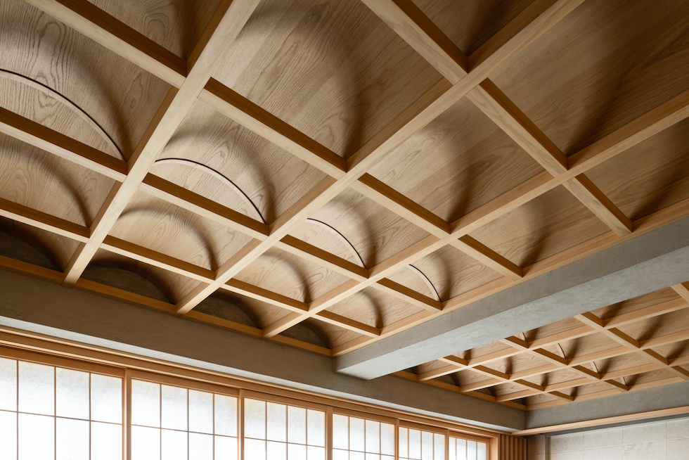 クライアントの要望であった「雪見障子」の柔らかい光を受け止める装置としてヴォールト形状が反復するような奥行きを持った格天井を計画した。このヴォールト形状の天井面に時間や天候によって移ろう美しい陰影を映し出すことで、その現象自体が社長室としての格式を表現したいと考えた。夜には天井全体が照明装置として機能し空間全体を演出する。