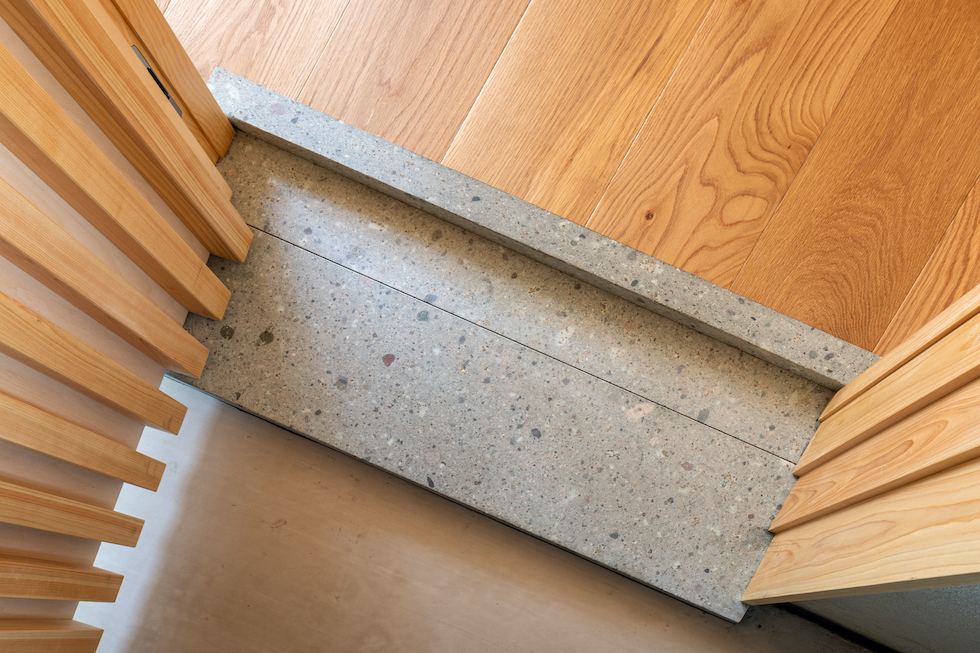 座席の背面には何十年という時間軸で表情がわずかに変化し続ける「錫」を用いることで、壁そのものが時間を内包した絵画のような存在となる。また、敷居石として創業者の生誕の地である富山県で採掘される美しい緑色の「金屋石」を用いた。いままでの歴史とこれからの未来を繋ぐような空間を目指した。