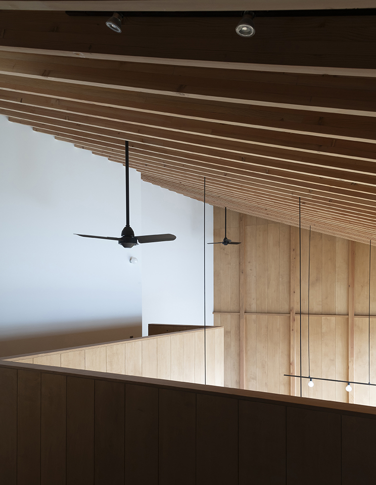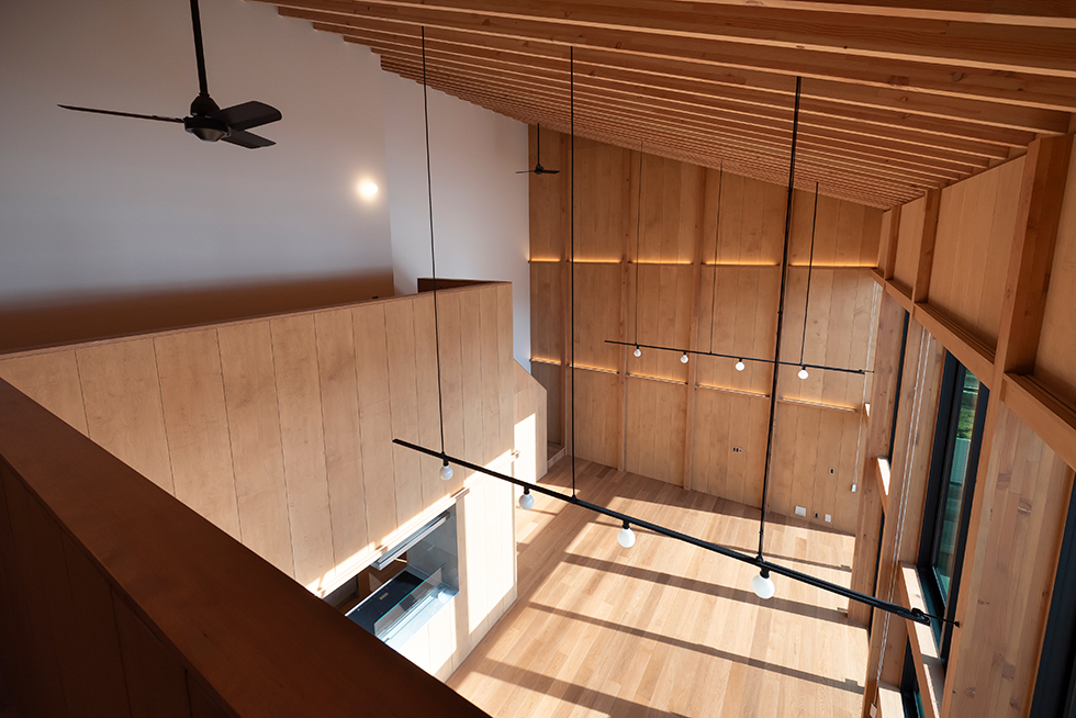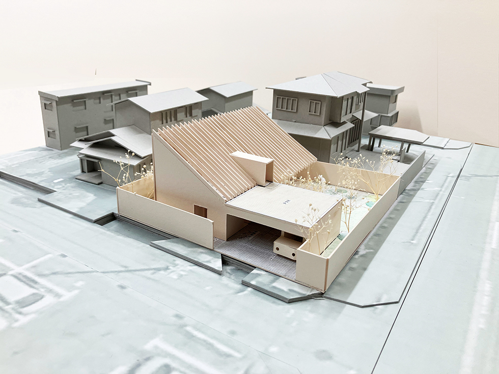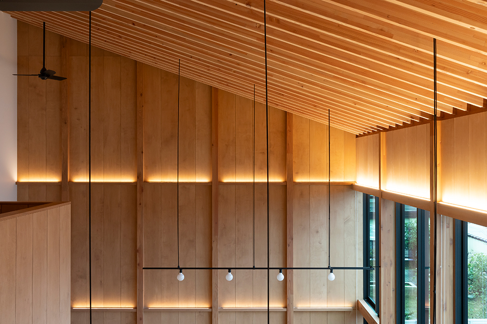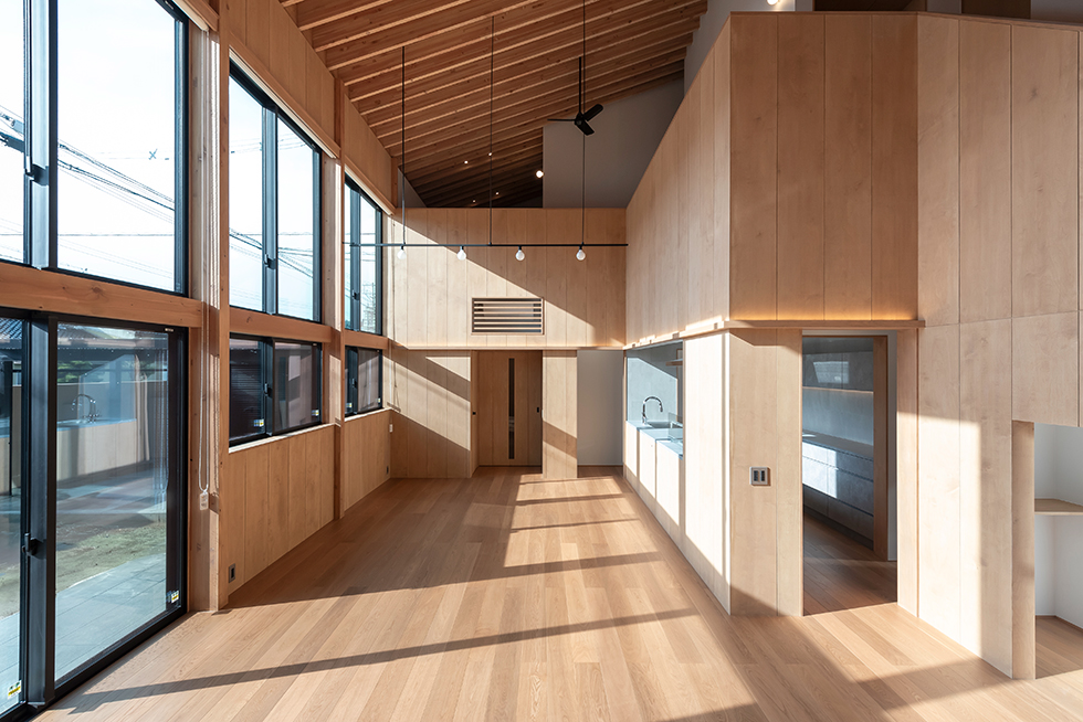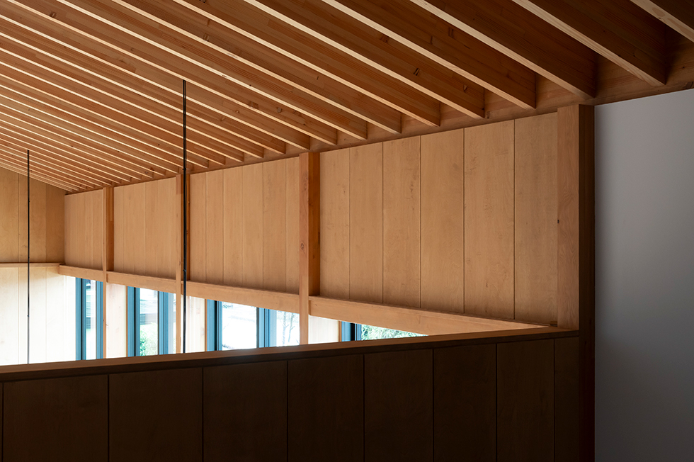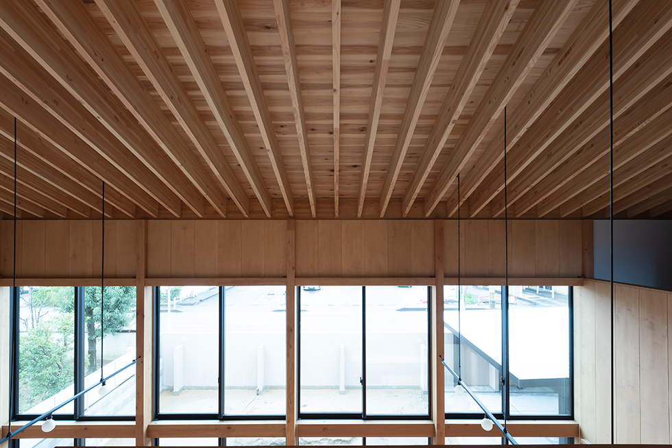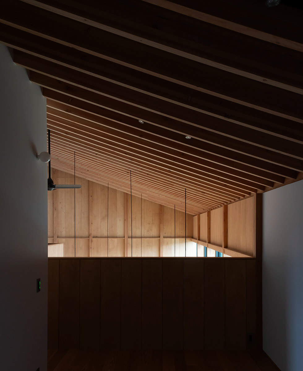 子供の成長と共に家族が大切な時間を過ごせる場は何かと考えた。検討を重ねるなかで、南庭に降り注ぐ光を大窓を介して室内に取り入れ、時間や季節の変化を映し出す大きな勾配天井のあり方を考えることが、流れゆく時間の背景になるのではないかと感じた。この天井は通常用いる梁よりも繊細な梁を反復させることにより、美しい光の陰影の微細な変化を感じ取れる計画とした。シンプルな操作ではあるが天井という一つの要素を超えて、家族と共にある存在として生活を彩る。北陸の環境であるからこそ機能する素直にあり方だと思っている。