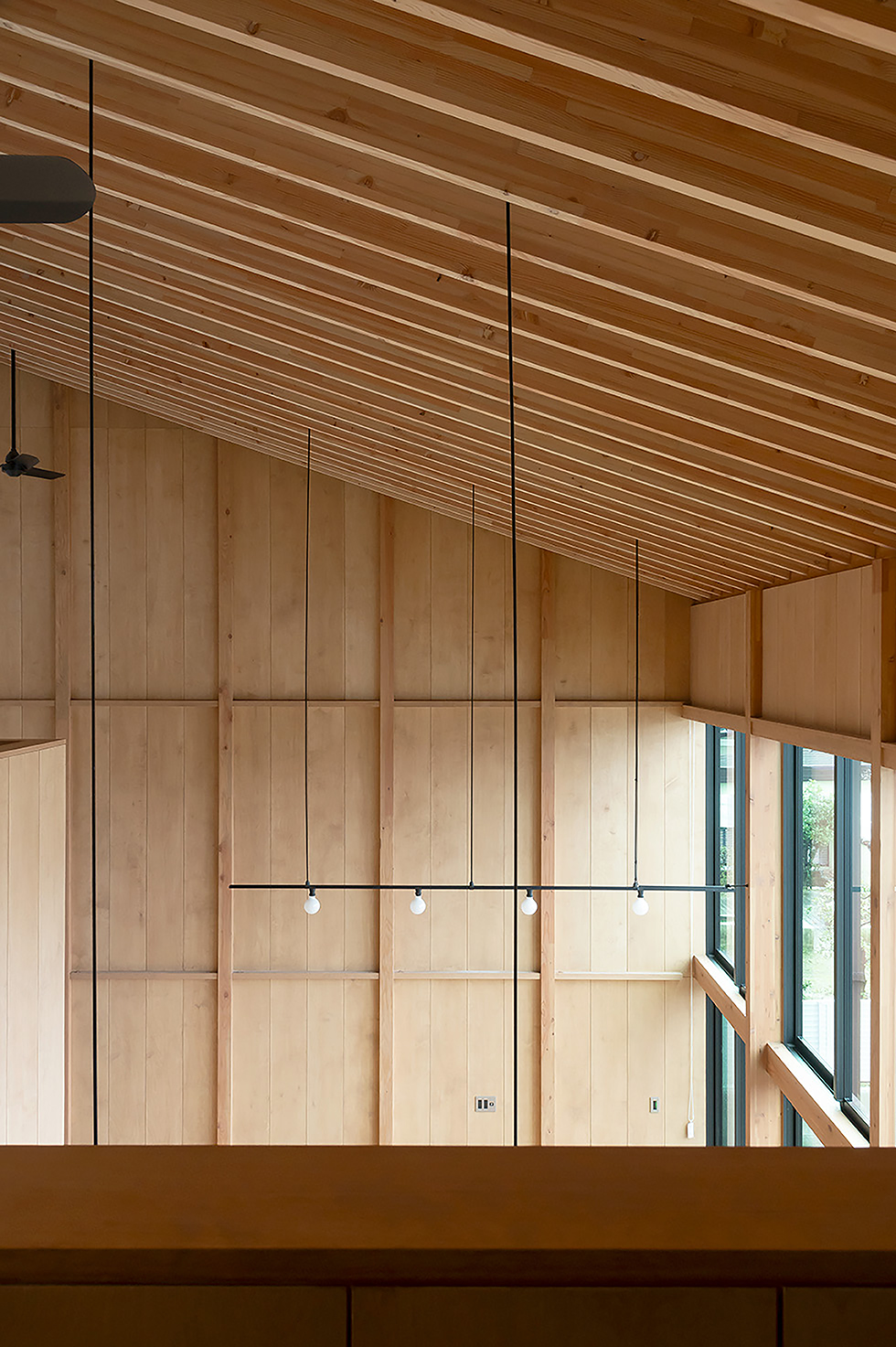 子供の成長と共に家族が大切な時間を過ごせる場は何かと考えた。検討を重ねるなかで、南庭に降り注ぐ光を大窓を介して室内に取り入れ、時間や季節の変化を映し出す大きな勾配天井のあり方を考えることが、流れゆく時間の背景になるのではないかと感じた。この天井は通常用いる梁よりも繊細な梁を反復させることにより、美しい光の陰影の微細な変化を感じ取れる計画とした。シンプルな操作ではあるが天井という一つの要素を超えて、家族と共にある存在として生活を彩る。北陸の環境であるからこそ機能する素直にあり方だと思っている。