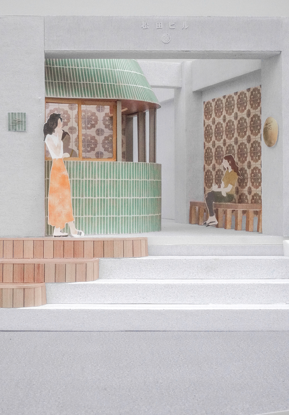 We extended the entrance area of a construction company's office building, which has an 80-year history in Sendagaya, to include a small take-out soft serve ice cream shop. The shop is designed with a fan-shaped floor plan to subtly separate the flow of people entering and exiting the building from those using the shop, making use of the limited space in the entrance area. Additionally, the shop’s curved wall has a slanted top, giving it a charming look, as if a small hut had been inserted into the building. The green tiles that cover the shop were specially made for this project, with a custom glaze color. We carefully selected a color that would complement the historic yellow tiles used on the existing building's walls, which we found to be very attractive, aiming to create a respectful balance between the two. The building, located on a slope, originally had a staircase at the entrance to compensate for the elevation difference, which made it feel somewhat detached from the street. However, with the addition of this shop, the steps have been transformed into benches or places for people to rest, turning the area into a welcoming spot. We hope that this shop will breathe new life into both the entrance space and the surrounding streetscape, becoming a place cherished by the people.