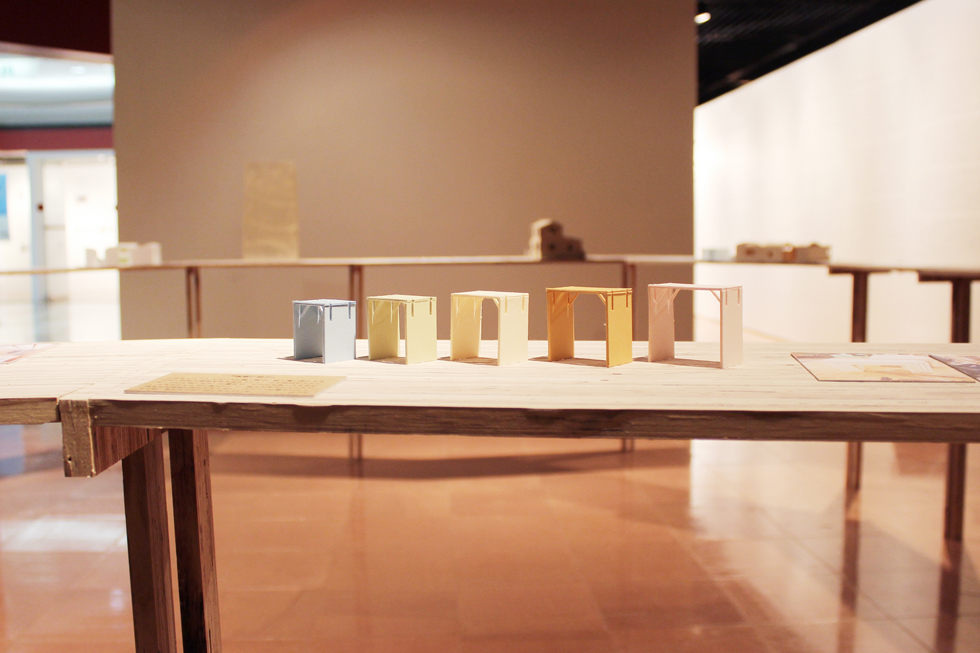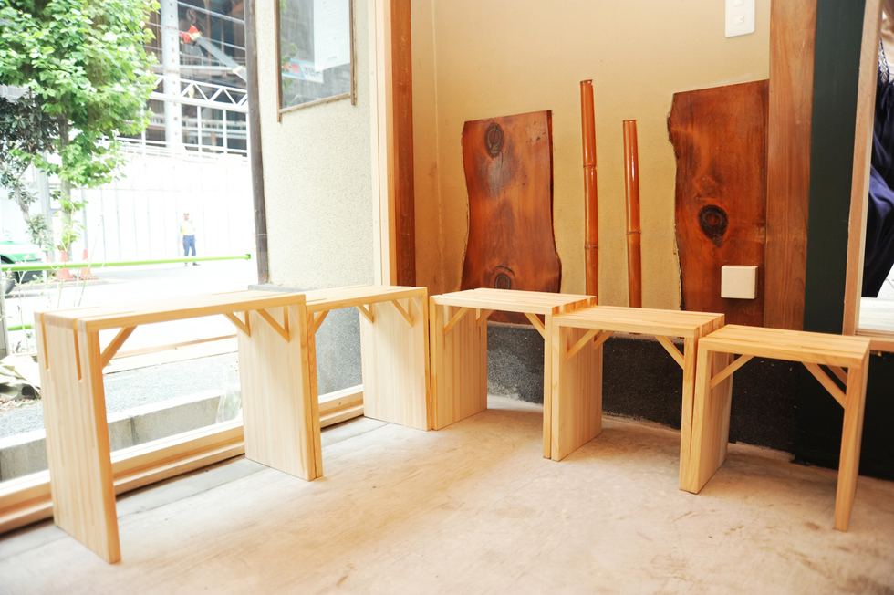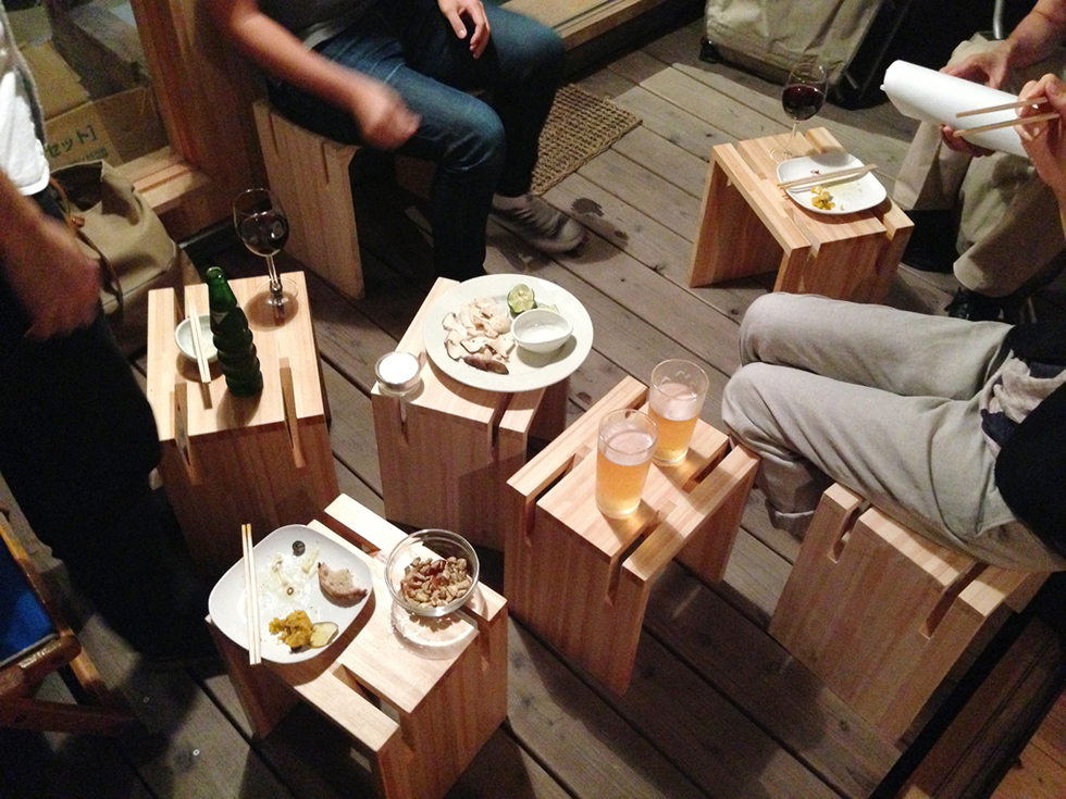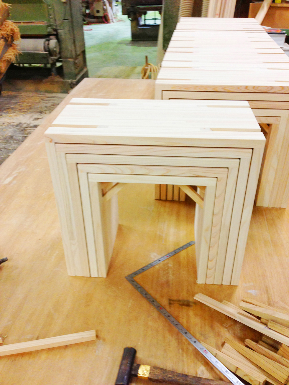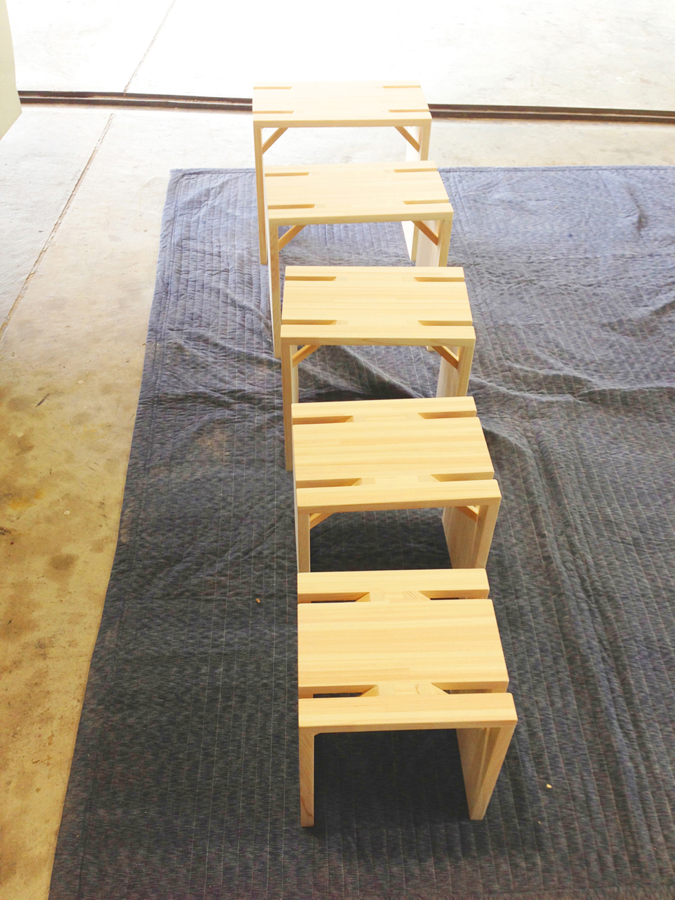 小さなイベントスペースに置く椅子。軽く薄い板にするために斜材で座面を支えるようにし、その斜材がスタッキングした際にきれいに重なり、片付ける楽しさを生む。大きさがそれぞれ違うことで、様々な年代の人たちが使用する場面に対応すると共に、バラバラに置かれたときも統一感を失わない形になっている。